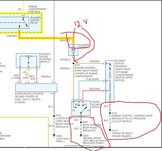 If that isn't the case, I suspect one of the grounds is weak or missing. Take a look through the schematic I provided. Make sure there is 12v to the motor itself (orange/red wire). If there is, check the two grounds I circled. One is for the switch and the other the resister.