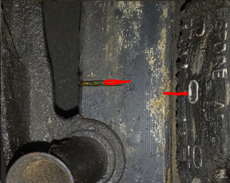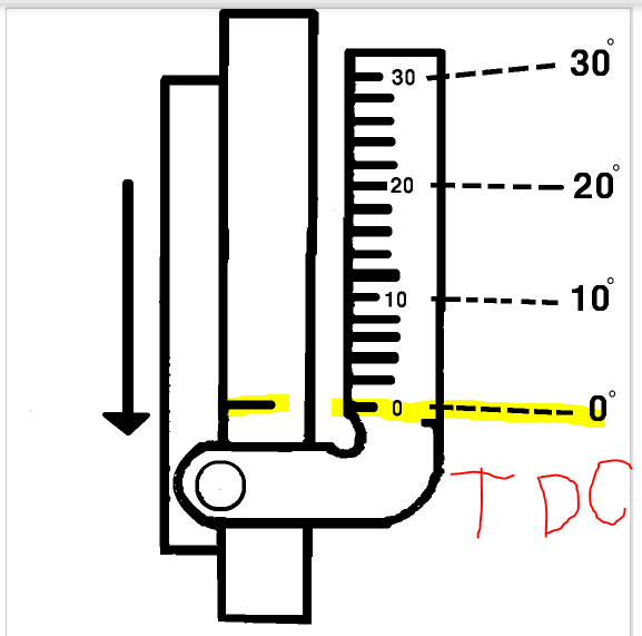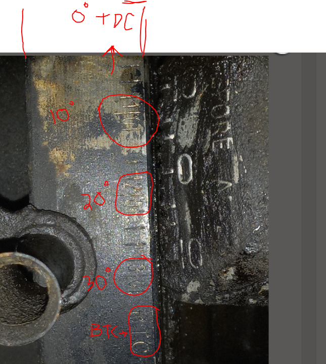 If you look below, I copied your second pic. At the very bottom, it says BTC, which means before top center. As you work your way up, it first indicates 30 degrees, then 20 degrees, and then 10 degrees. If you continue a little further, you should find 0 degrees or TDC.