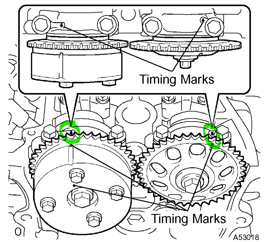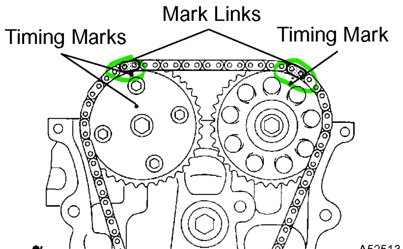 And finally, you'll be on to putting the main timing chain on with the lower and upper marks. Then the crankshaft position sensor plate with the "F" facing out.