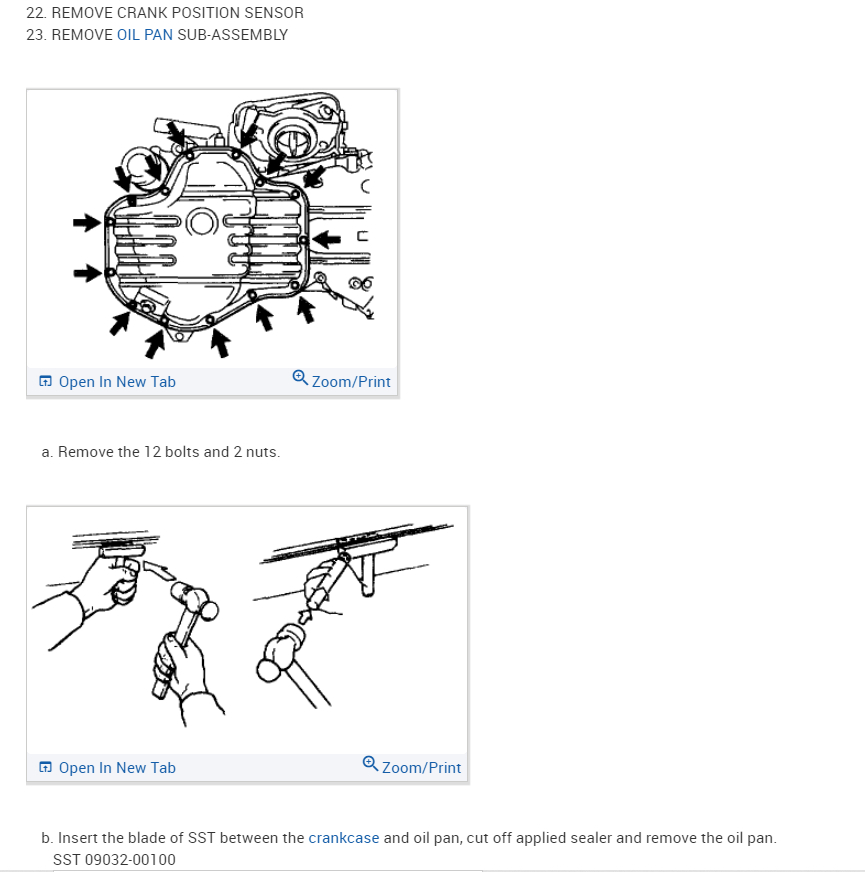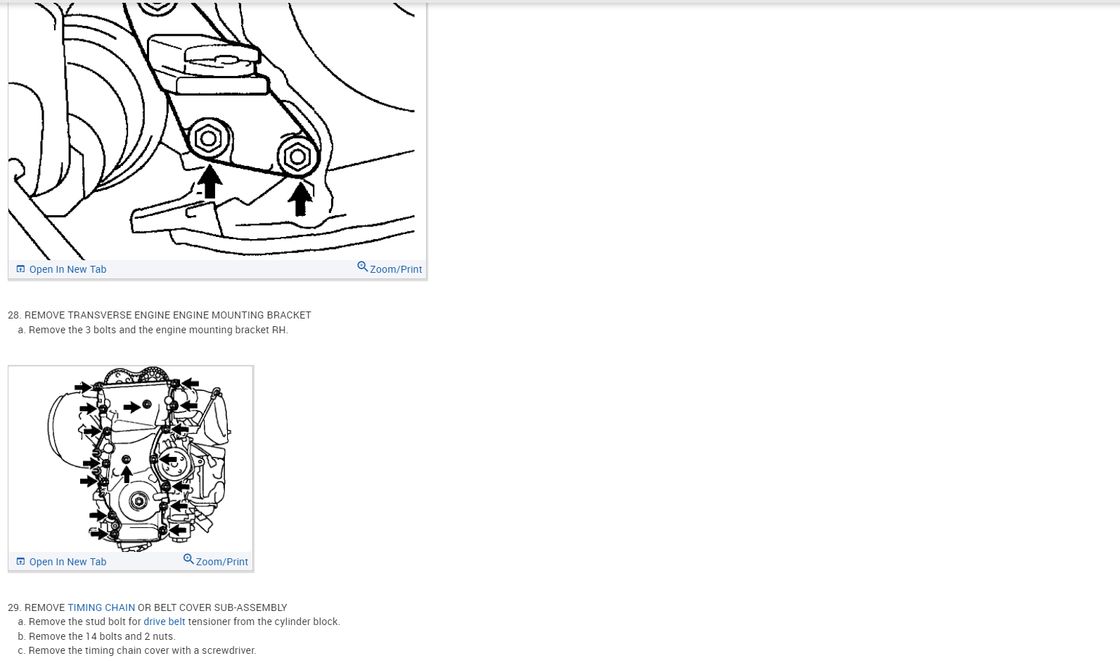 The motor mount must come out and you have to support the engine to get to the timing chain cover. You will need specific tools to get the harmonic balancer off (crankshaft pulley). Then the crankshaft position sensor, the timing chain tensioner, the drive belt tensioner (fifth diagram). The oil pan doesn't have a gasket, it's just an applied sealer that's put on.