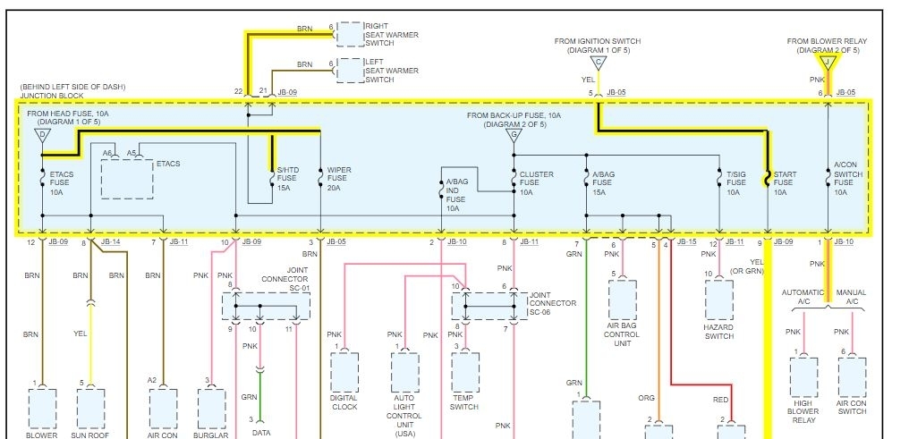 I have wiring issue if you can help. Driver side front quarter panel area was damaged before I had. Need to replace inner liners that protects wiring there, I did wrap and cover. This may have happened before I taped and covered wiring in wheel well area while I was fixing a shorted etacs and a/con issue or even removing and replacing battery hitting against harnesses, I am not sure. This I am not blowing fuses but I have no power now to three 10A fuses under dash: START, A/CON SW and RR HTD IND. It started and ran before now the car now does not start of course and shifter won't move, but after I turned steering wheel back and forth I did get shifter to move, steering wheel doesn't lock. Not sure where to start with this, perhaps I touched or moved wiring that was already weak or damaged. Is that A/CON SW fuse related to issue I thought was fixed or start fuse and not sure what RR HTD IND is? Any help you can offer is appreciated. Thanks