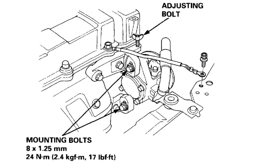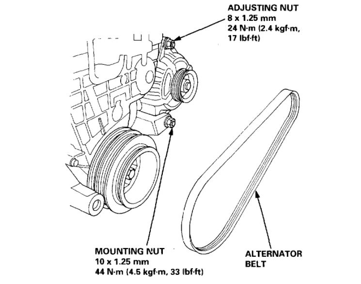 4. Loosen the adjusting met and mounting nut, then remove the alternator belt.
