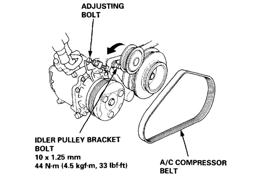 3. Loosen the adjusting bolt and idler pulley bracket bolt, then remove the A/C compressor belt.