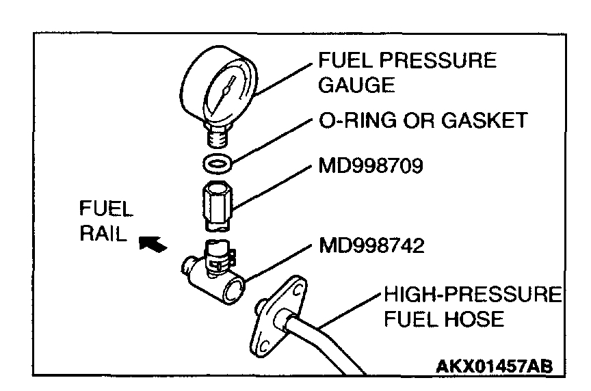 2. Place a suitable O-ring or gasket on assembled special tools MD998709 and MD998742 and install the fuel pressure gauge.