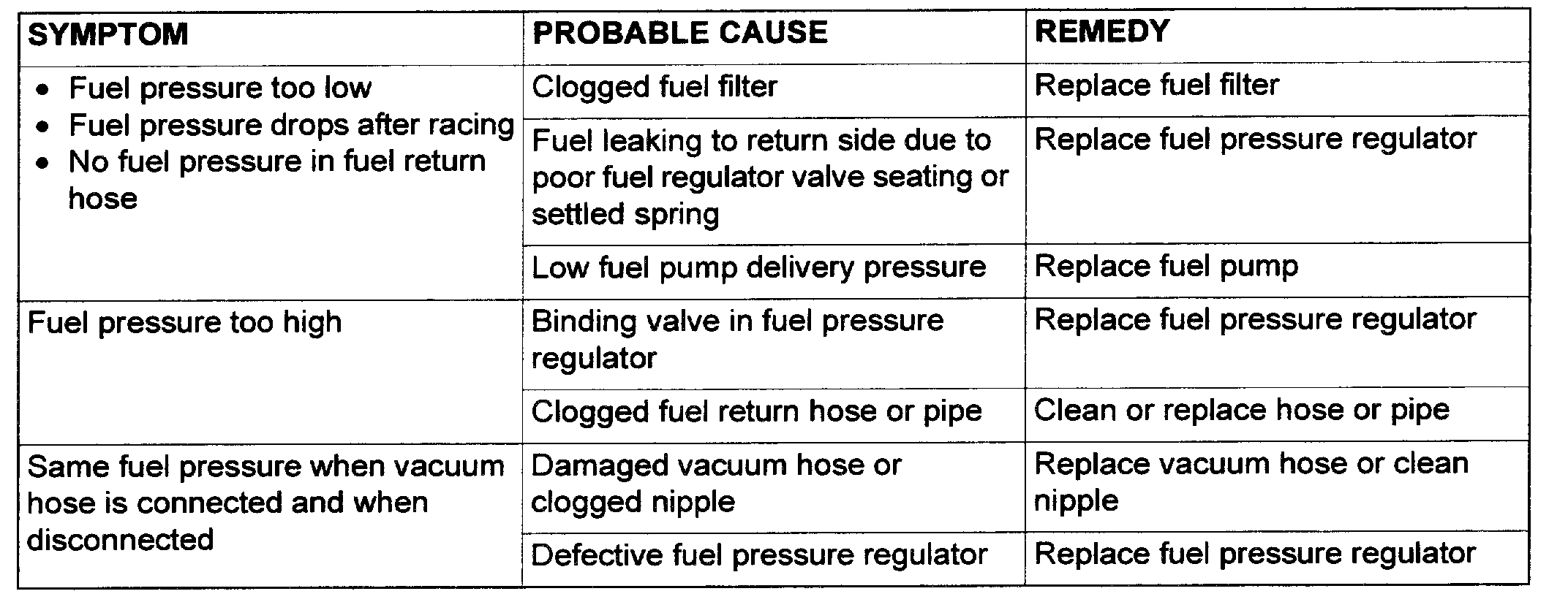 13. Stop the engine and observe fuel pressure gauge reading. It is normal if the reading does not drop within two minutes. If it does, observe the rate of drop and troubleshoot and repair according to the table. Start, then stop the engine.