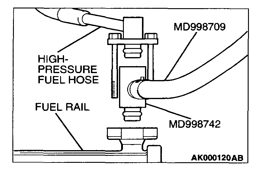 15. Remove the fuel pressure gauge, and special tools MD998709 and MD998742 from the fuel rail.