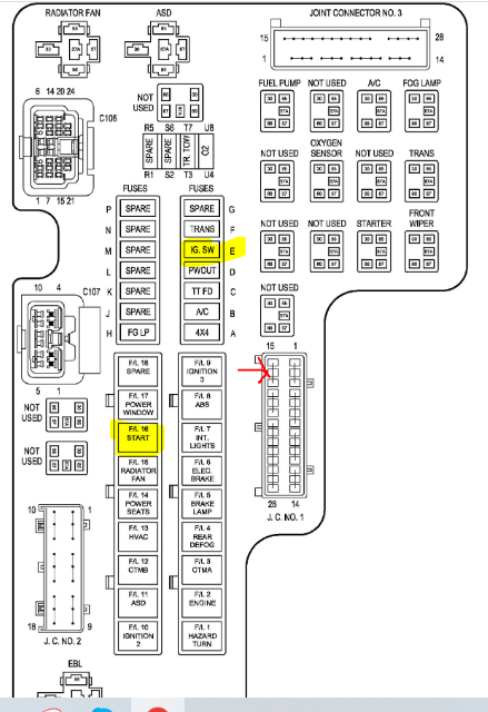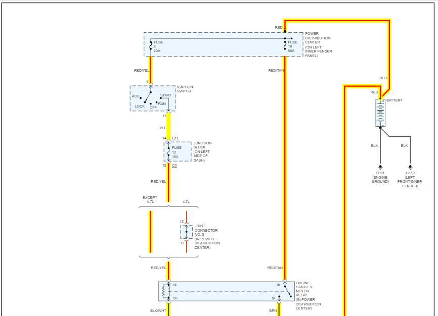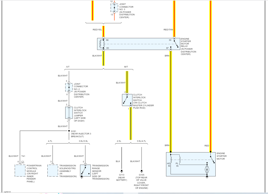 As far as the starter, I attached the wiring schematic below of the starter circuit, so you have a reference. There are three fuses, fuse E and fuse 16 in the under-hood fuse box. And check fuse 12 in the fuse box under the dash on the driver's side.