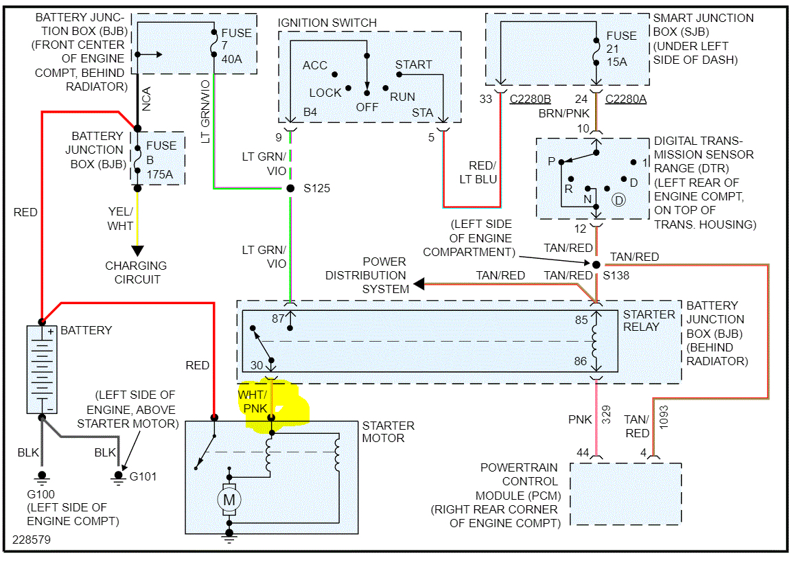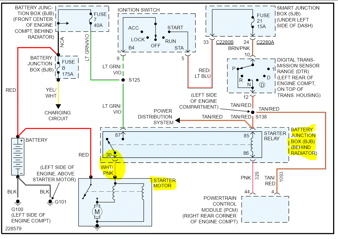 I attached the wiring schematic below for you to review. Take a look through it and confirm the fuses are good, the starter relay is good, and there is a trigger wire on the starter motor.