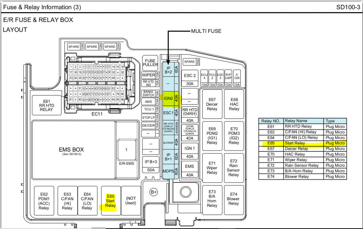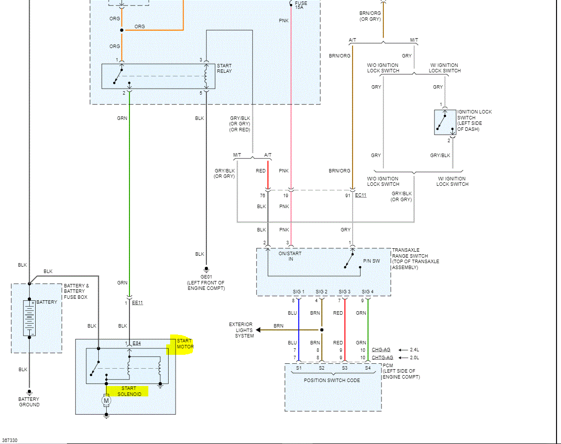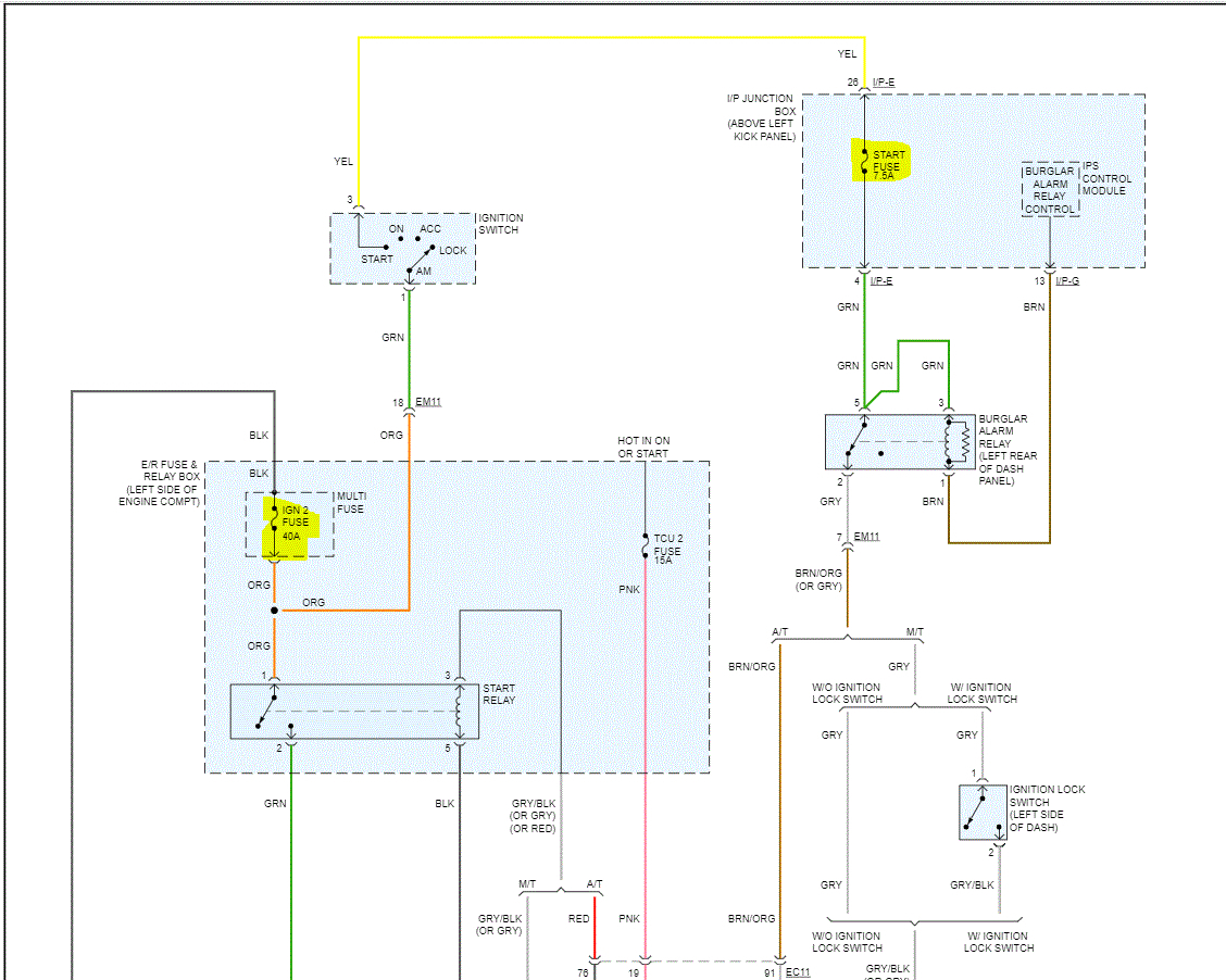 I attached the wiring schematic below for the starting system (standard key start). I highlighted the two fuses in the pic. If you follow the wires from those fuses, both go to the starter relay. However, there are a couple of variables for it to work (we will look at those as possible issues if needed).