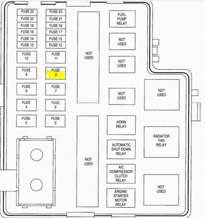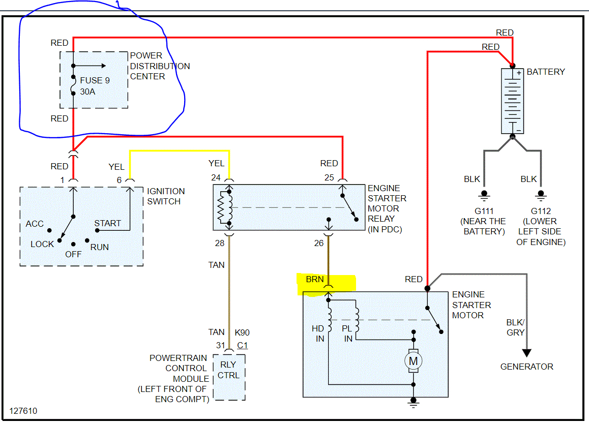 I also need to confirm where your brother saw the spark. Was it at the starter itself? If so, it could have blown fuse 9 in the under the hood fuse box. See the attached pic. I circled the fuse I need you to check. Also, if the fuse is good, I need you to check for power to the brown wire (smaller one) on the starter itself. That wire will only have power when the key is in the start position, so you will need a helper.