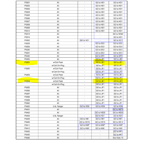 - Determine which coil is not firing properly using information from Pinpoint Test JB or DTC and the table at the beginning of this pinpoint test.