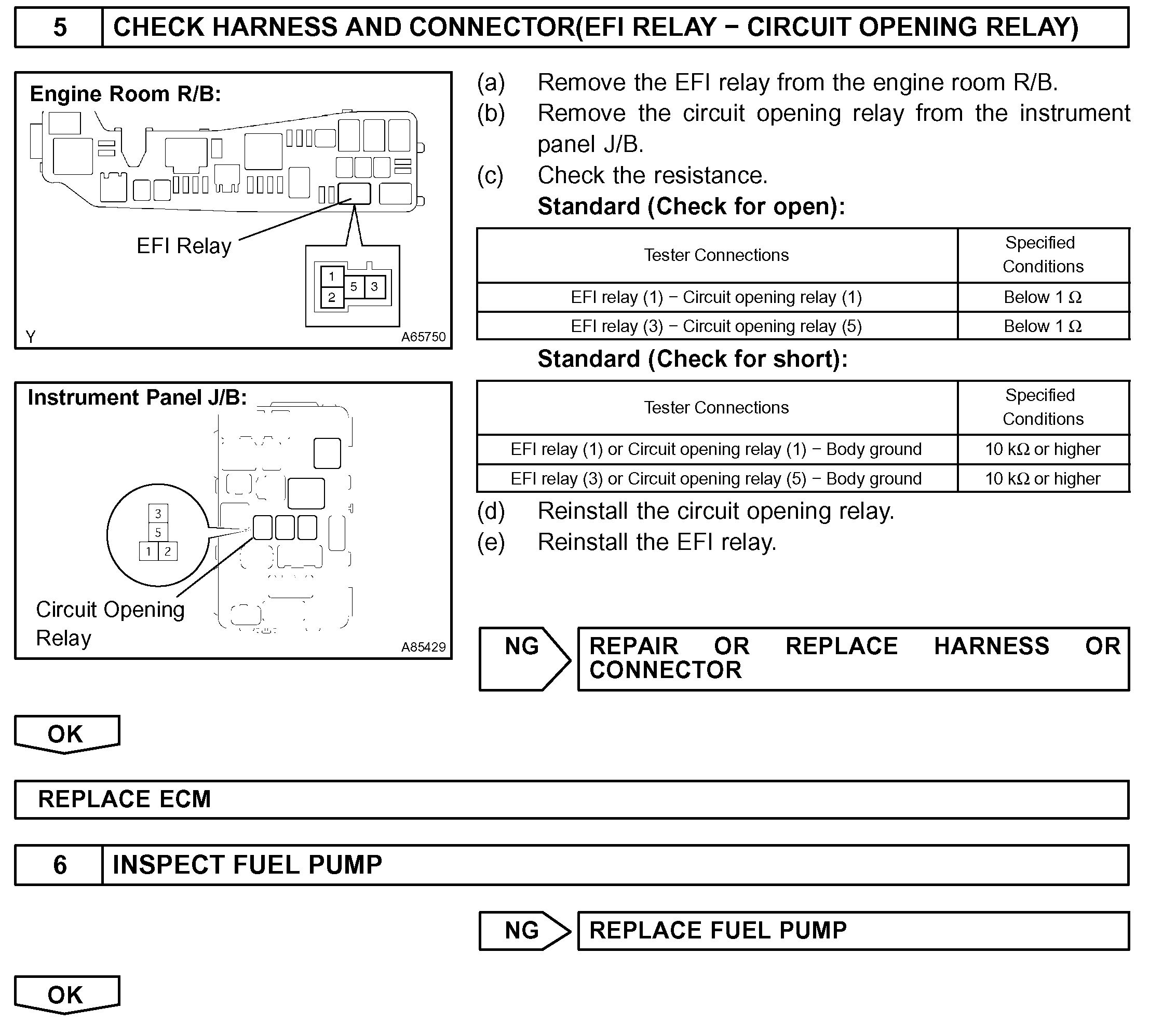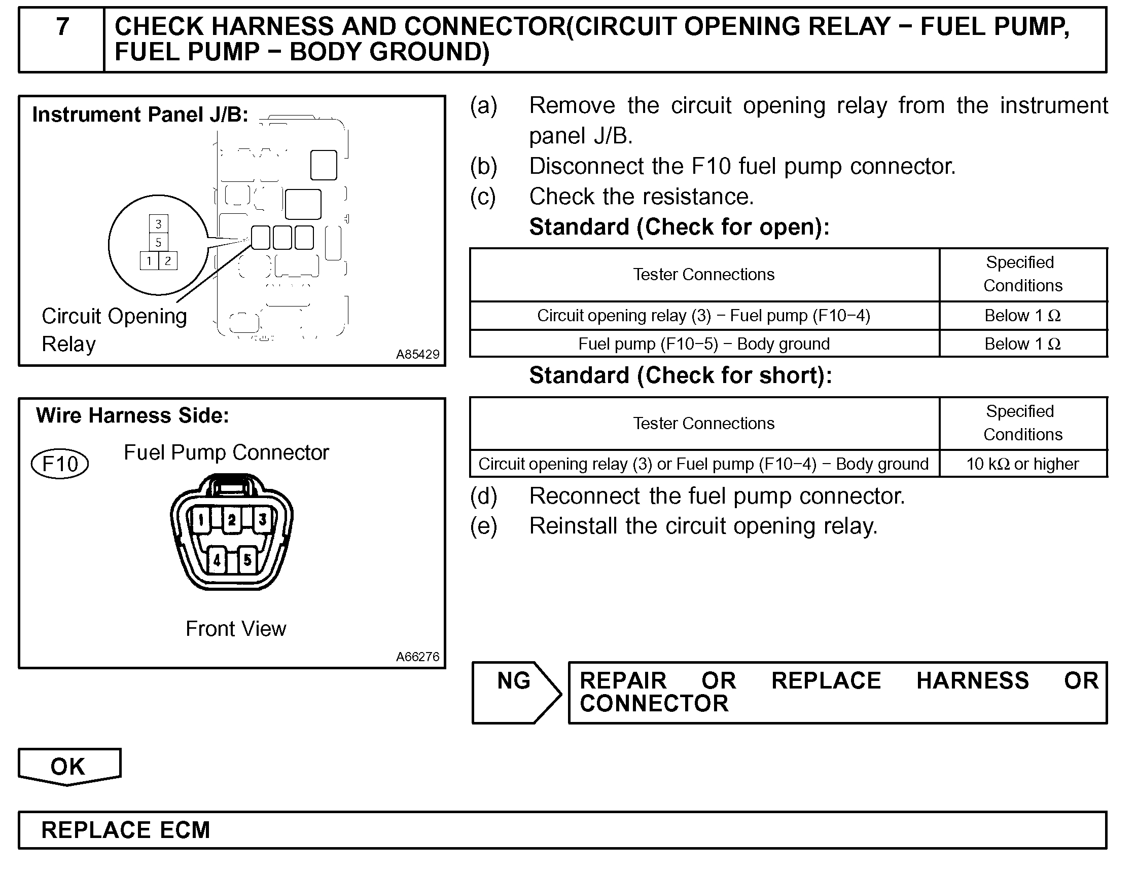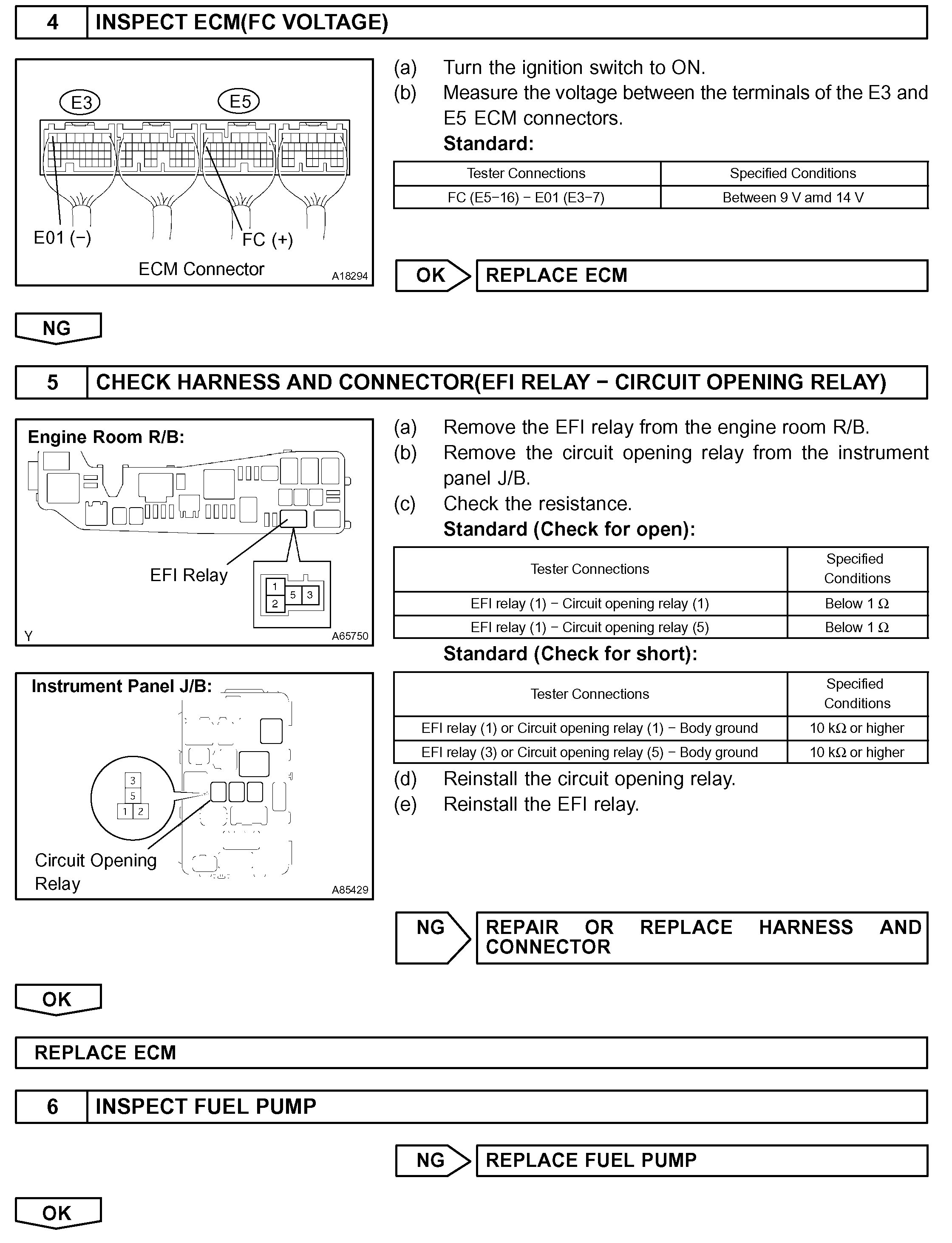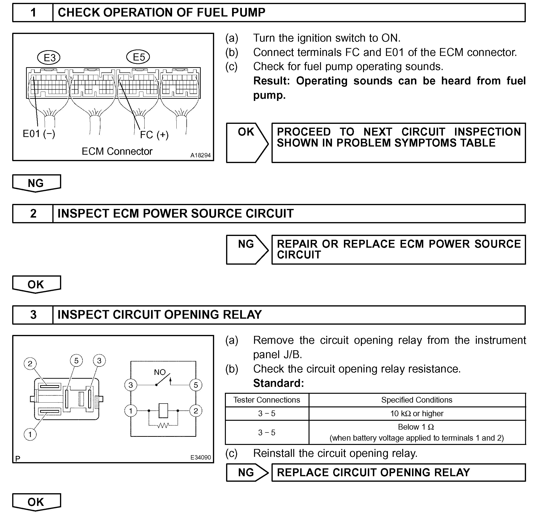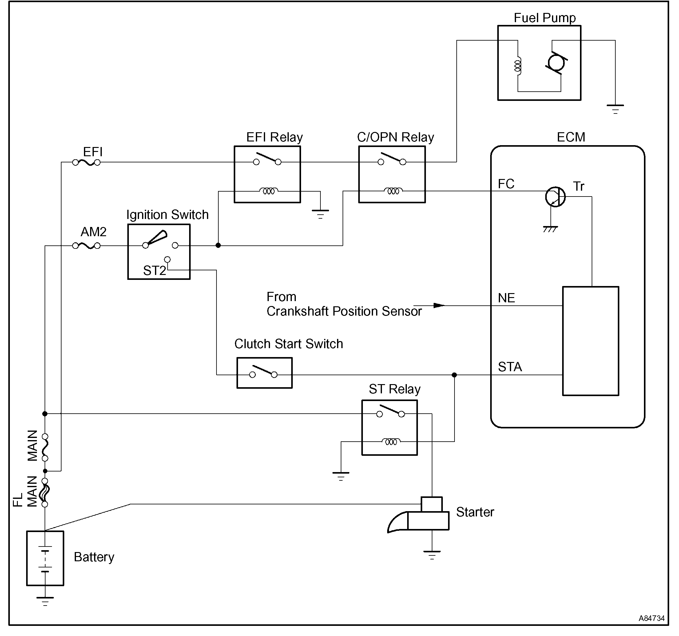 When the STA and NE signals are received by the ECM, Tr (power transistor) is switched on, allowing a current to flow into the circuit opening relay coil. The circuit opening relay switches on, power is supplied to the fuel pump and the fuel pump operates.