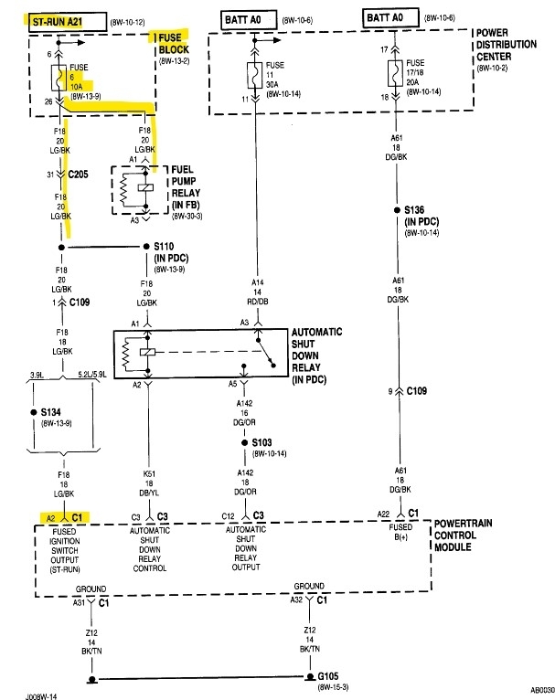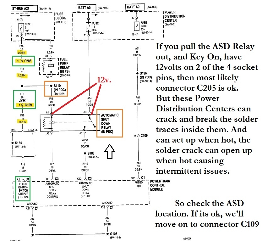 The 3rd diagram is of Fuse 6 10amp which feeds the fuel pump relay, the ASD Relay and PCM C1 A2, there are a couple of connectors in between the fuse panel and PCM. So, check Fuse 6, I believe this is the fuse block inside the vehicle.