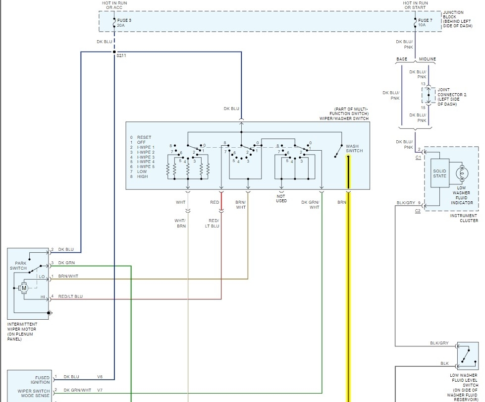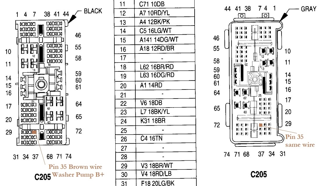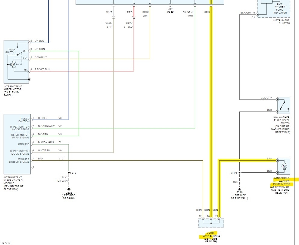So, in the OEM diagram the washer pump's power feed comes from connector C205 next, which is just below the data link connector, it's still a brown wire there, pin 35. Then goes to that Joint Connector No. 2 which is probably on the steering column going towards the switch.