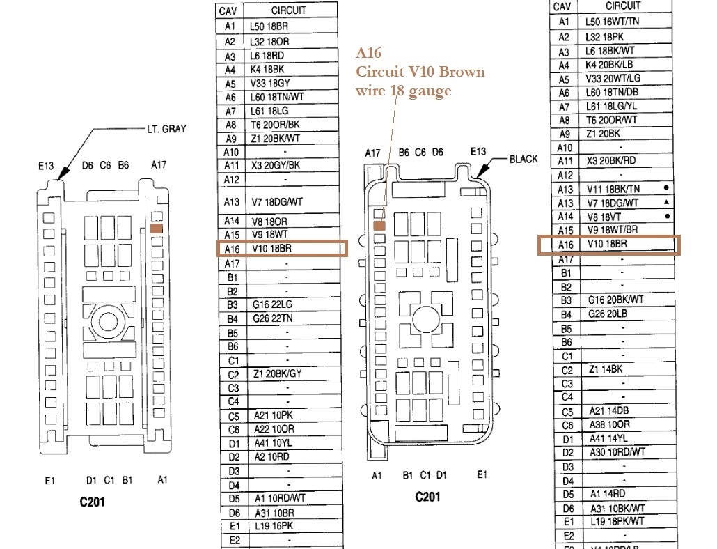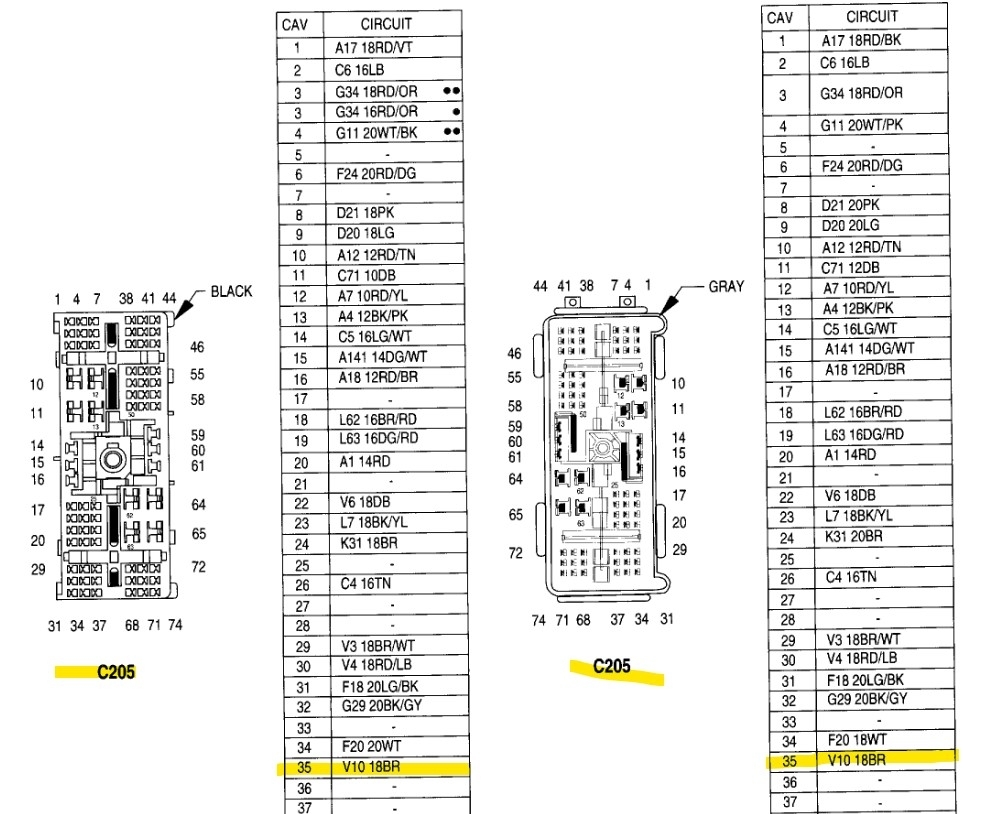 The 6th diagram is as far as they go with that connector, it's a white connector and should have 3 brown wires, but it might actually be plugged into the fuse block on the driver side dash, because they have the brown wires labelled as pins 20, 21, 22, so if power is missing a C205, I'd go to the back of that Fuse Block.