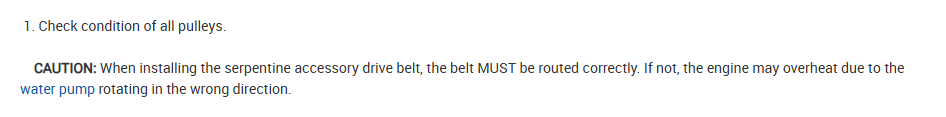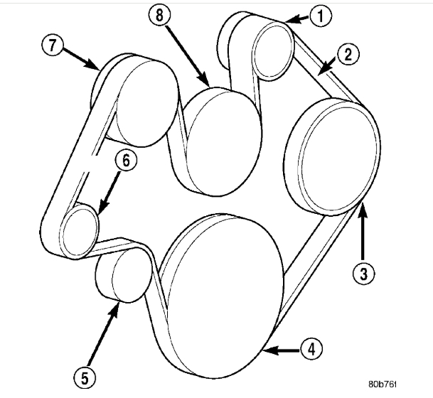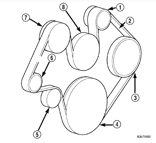 See if the belt feels tight. If it does, replace the belt. I attached the directions below specific to this vehicle to replace the belt. Note: There are eight and seven pulley designs. I provided the seven-pulley design which is more common. If you do have the 8-pulley design, let me know.