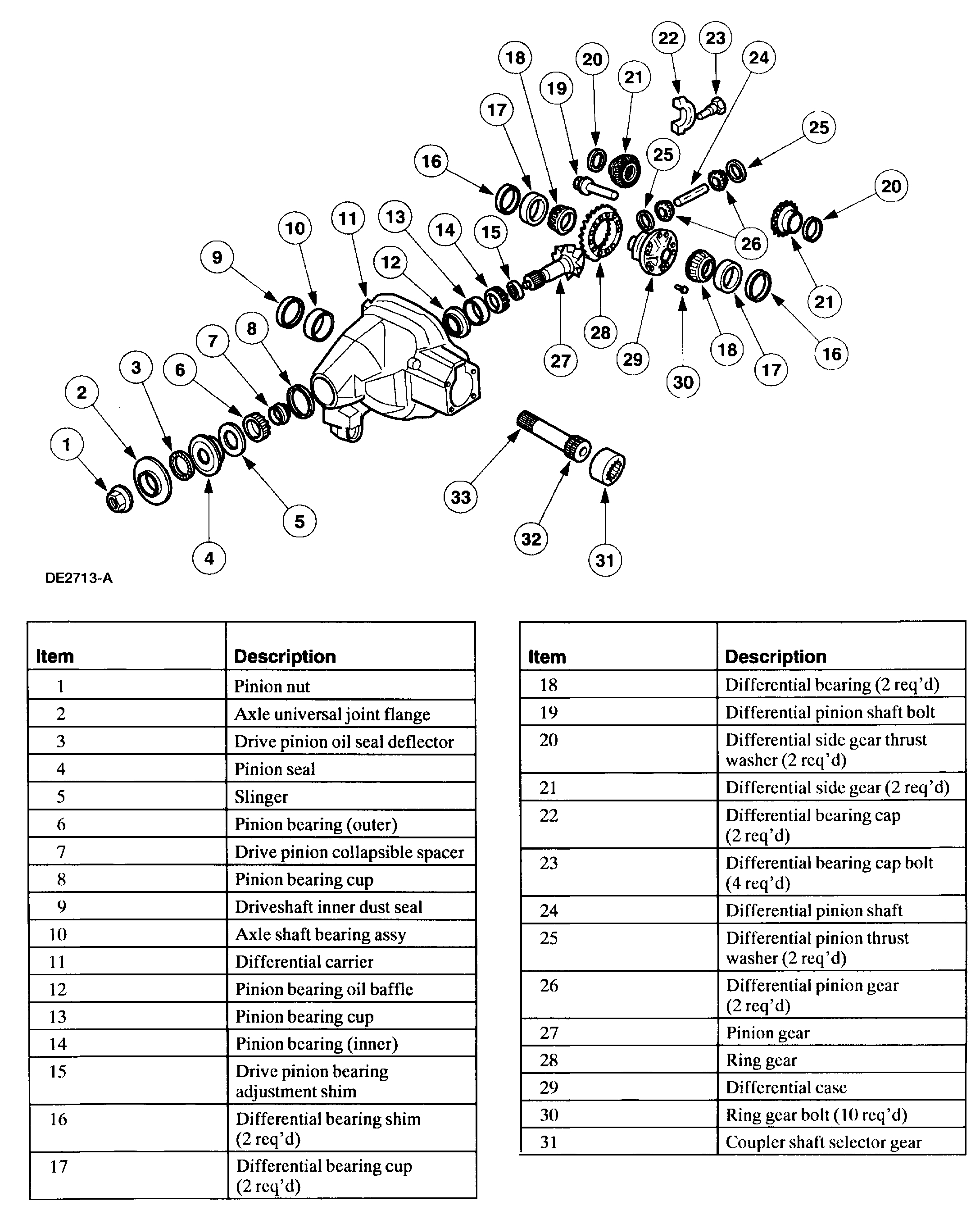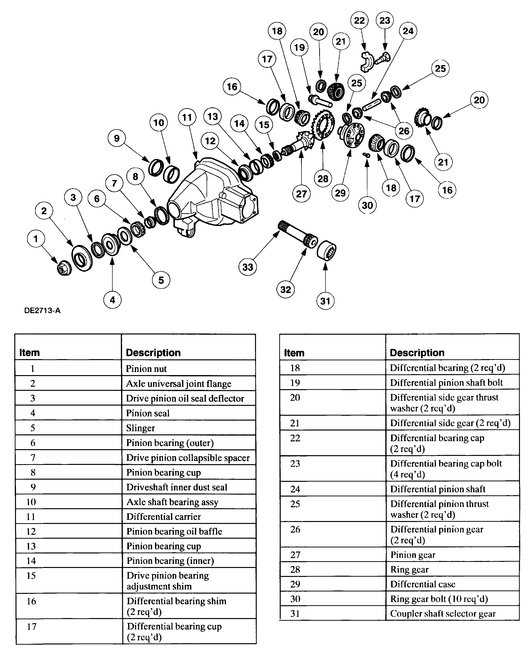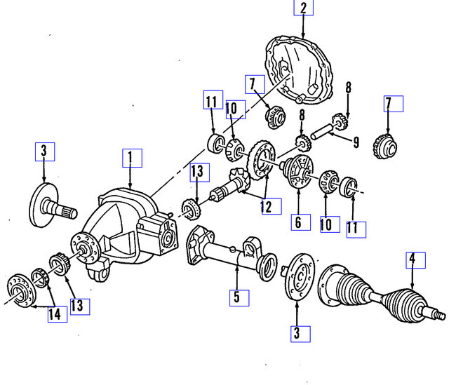 As you will see on the attached pictures, there are several bearings in the differential as well as the extension housing, where the seal and axle come together. Any of them can be bad as a result of low fluid. However, I would first question the extension bearing closest to the seal that is leaking. It may have caused the seal to fail.