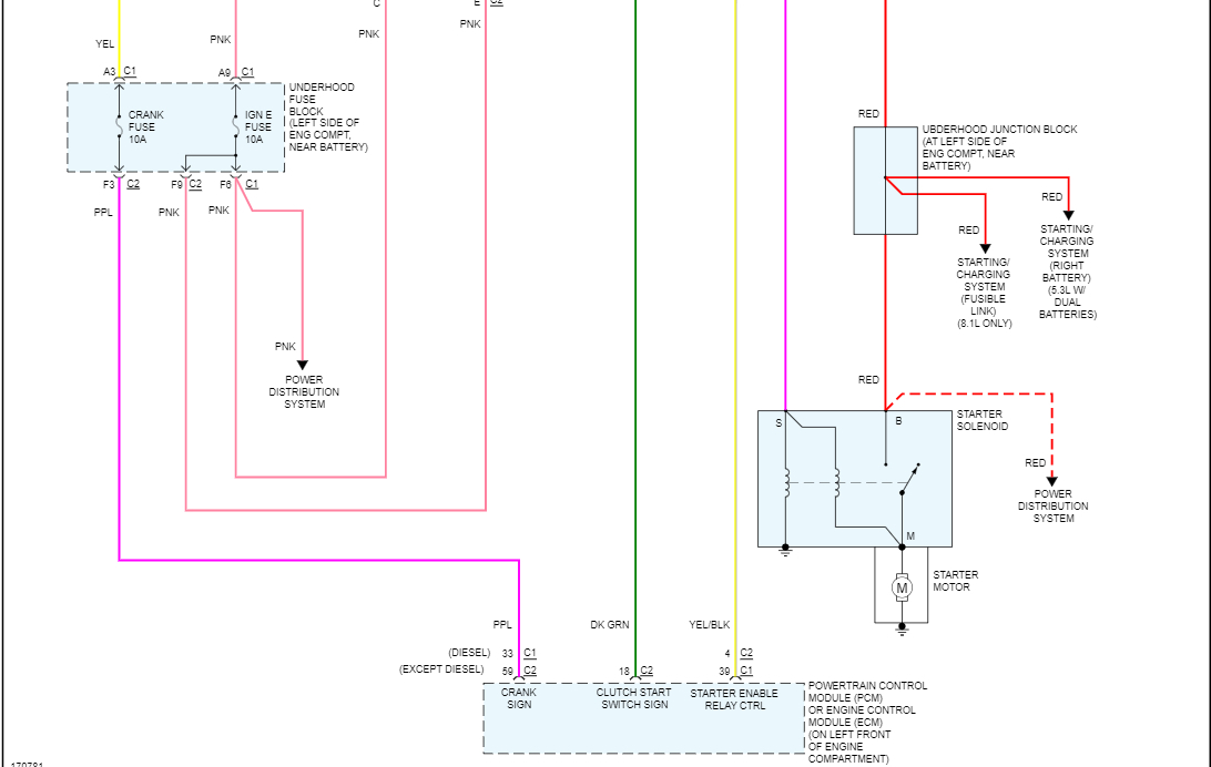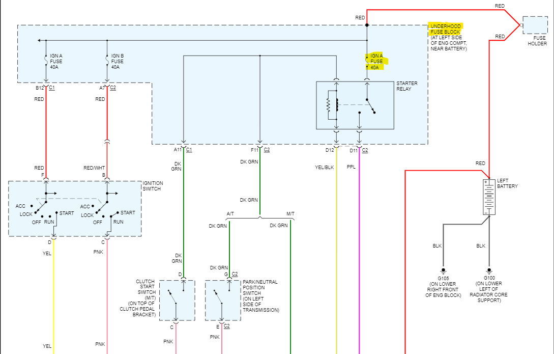This is the Starter circuit wiring diagram, first check that the IGN A Fuse 40amp has power on both sides and is not blown. Using a test light hooked to battery negative is the best way when checking starting circuits, it puts a little bit of a load on the circuit. If the fuse is ok, then pull out the Starter Relay and with the Key On there should be power on 2 of the 4 pins where the relay sits. Verify those first. The PCM is responsible for Grounding the control side of the Starter relay, so that will be checked next.