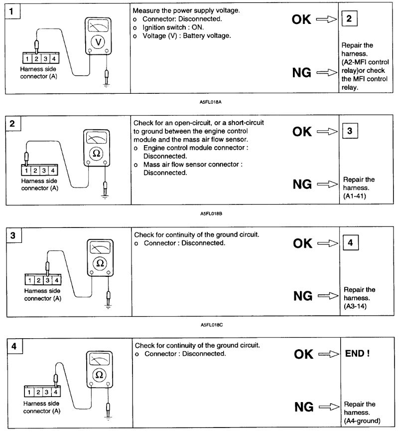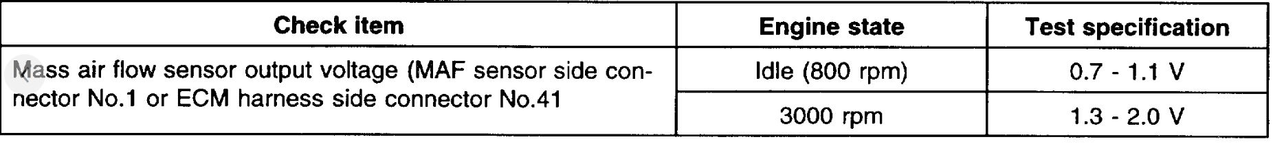 2. If the MAF sensor output voltage is other than 0 when the ignition switch is turned on (do not start the engine). Check for the faulty MAF sensor or ECM.