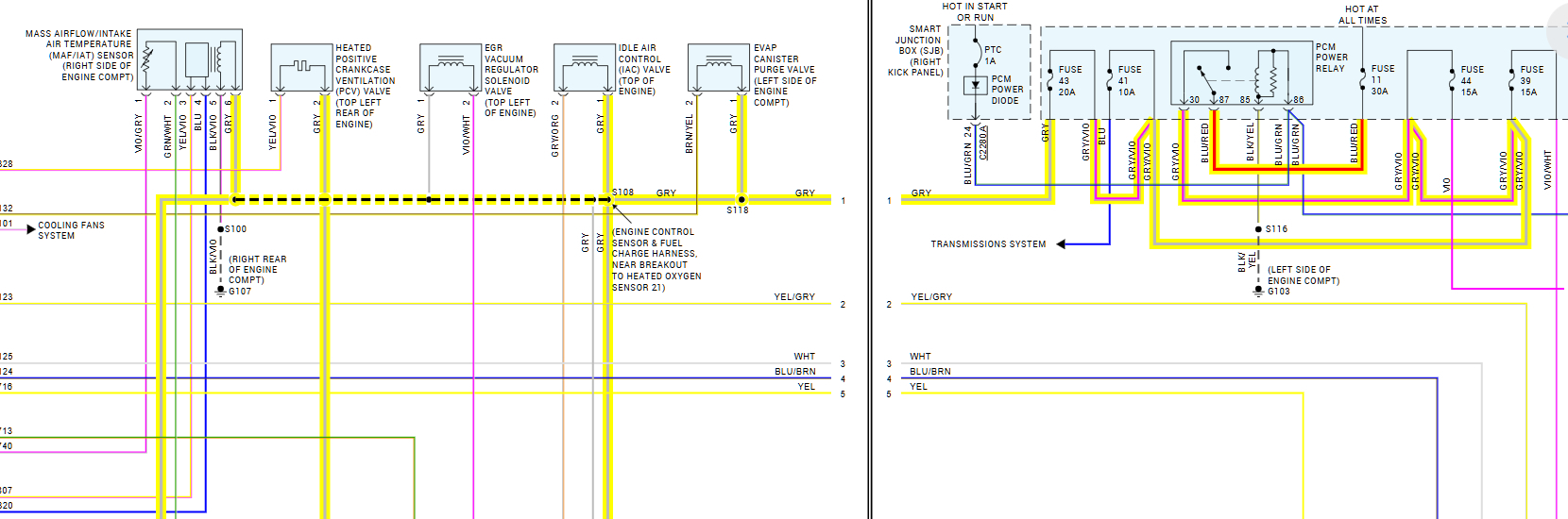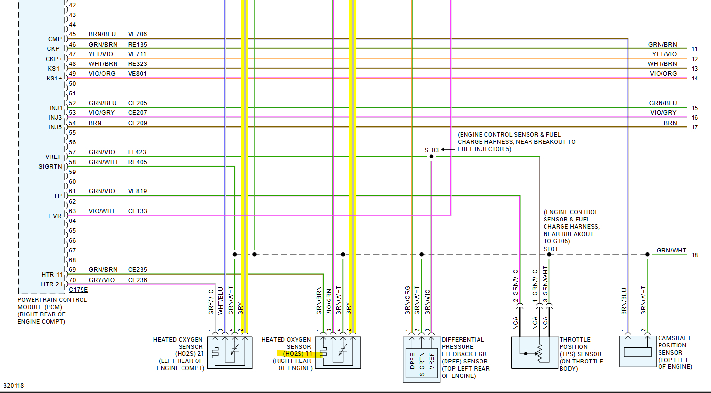 This grey wire is the power feed for the oxygen sensor heaters, and the 2nd diagram shows where the power originates from, but you would be missing power for a bunch of other actuators as you can see if it was a fuse issue. So it sounds like there is a break in the Grey wire somewhere in between the sensor and the smart junction box behind the passenger side kick panel.