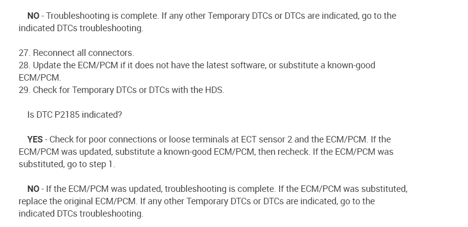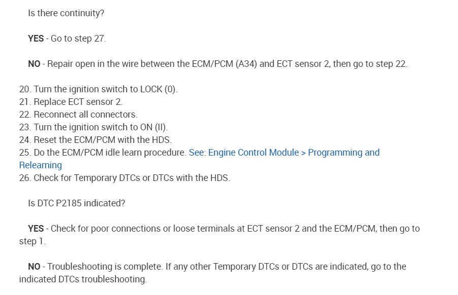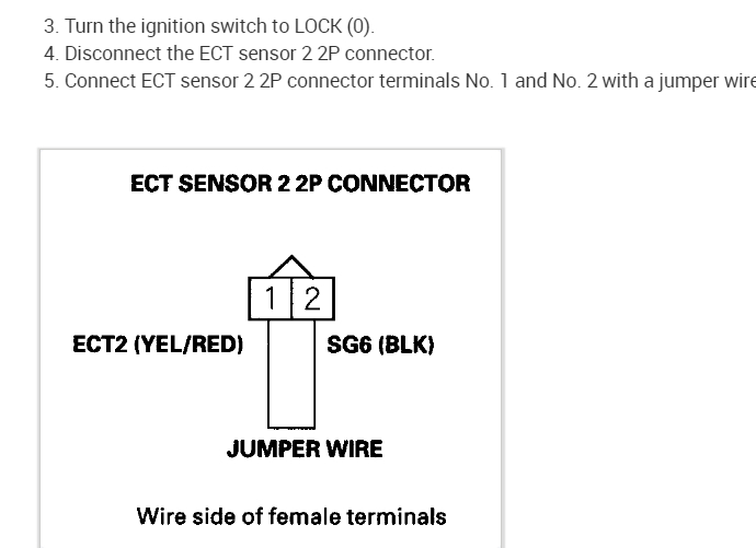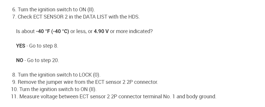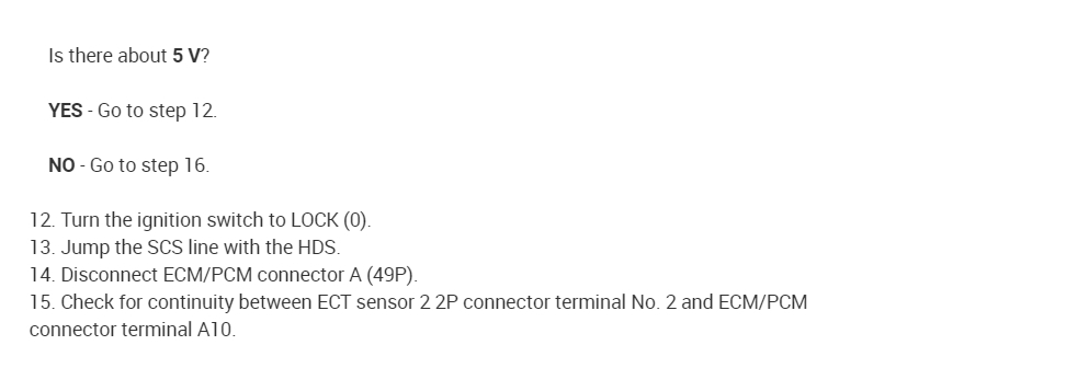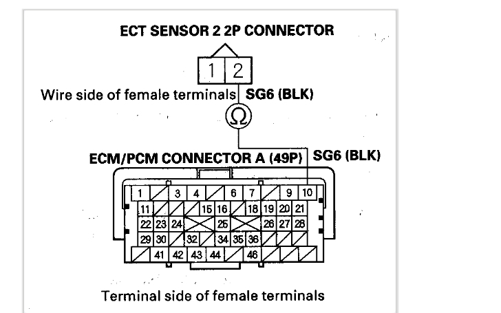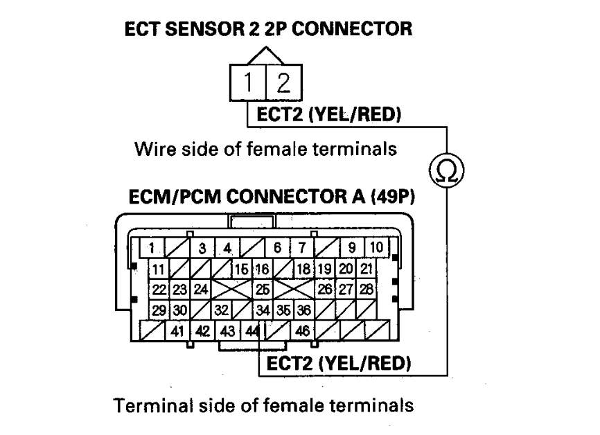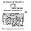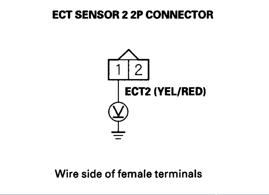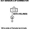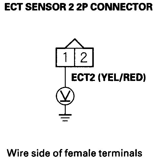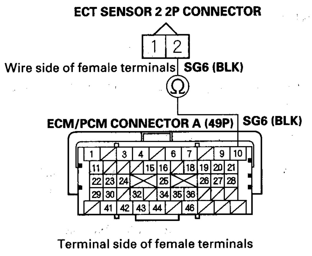 5. Check for continuity between ECT sensor 2 2P connector terminal No. 2 and ECM/PCM connector terminal A10 (see attachment 2).