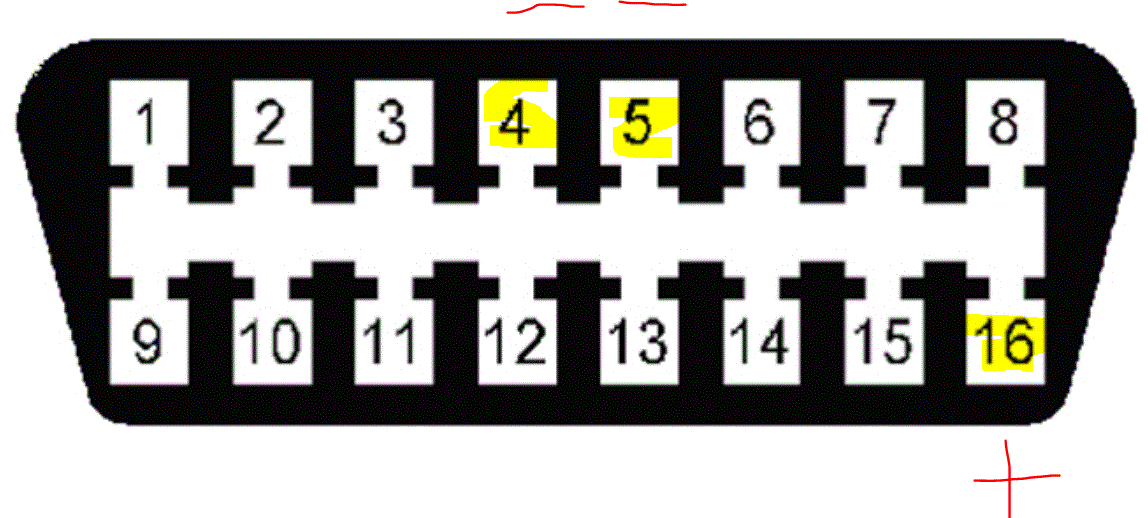If you look below, pic 1 shows the DLC pinout. I highlighted pin 16 and placed a + under it indicating power to it. Additionally, I highlighted pins 4 and 5 and placed a -- above them indicating ground.,