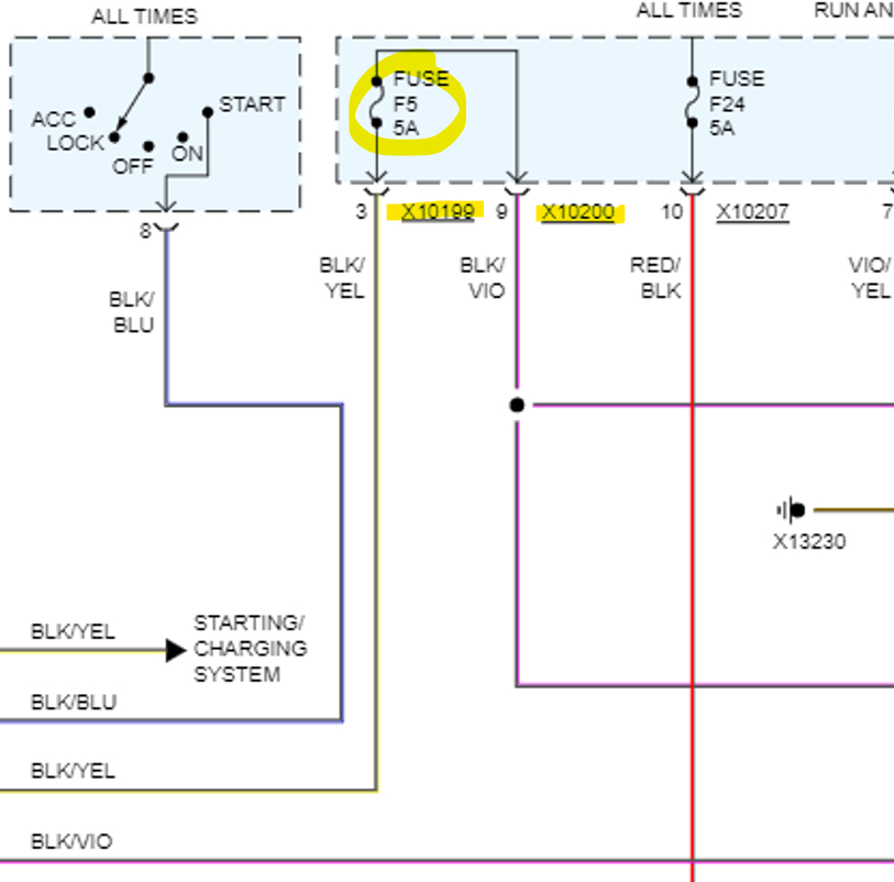 Below is the X10199 comes from the Immobilizer Unit to Fuse F5 and goes back out to the Instrument Cluster on this connector X10200.