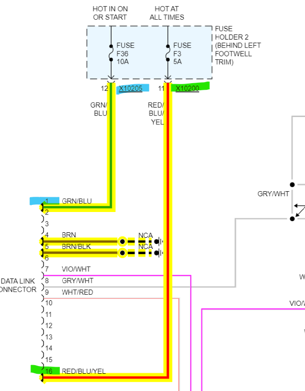 Also 5th diagram X10205 is for Fuse 36, pin 1 of the DLC