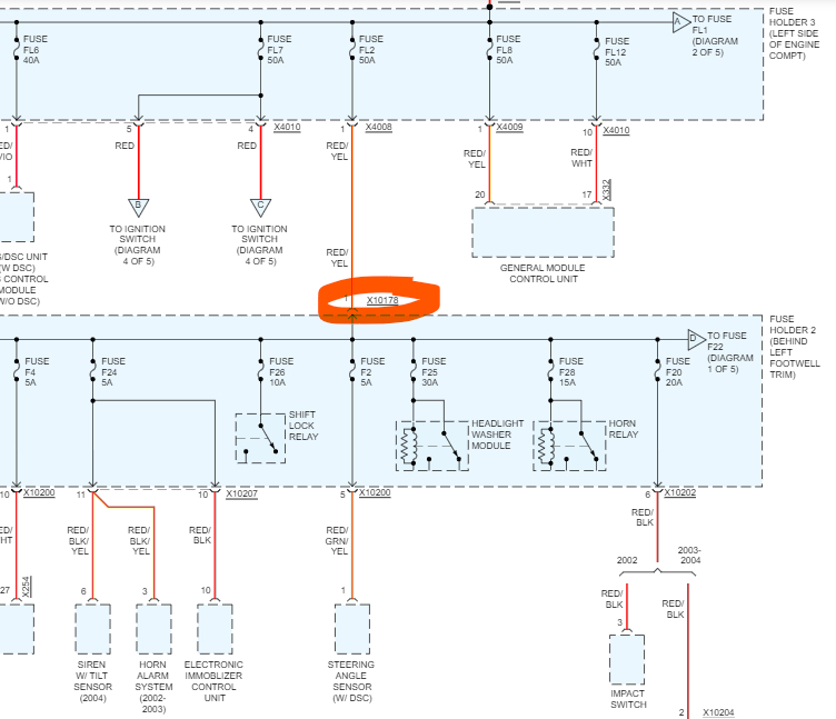 Last one, last 2 diagrams, that connector X10178, pin number 1 on that connector feeds power to that whole fuse panel on a Red/Yellow wire, it will be a higher gauge wire because its powering up so many components. The Red/Yellow wire comes from the Fuse Panel in the engine compartment from Fuse FL2 50amp.