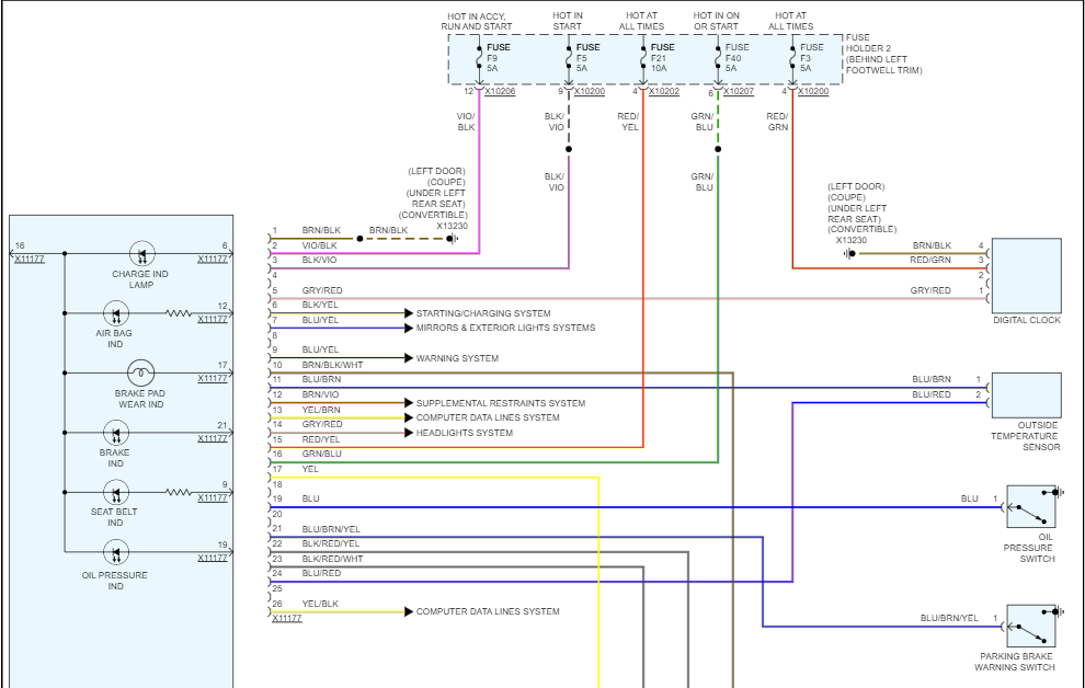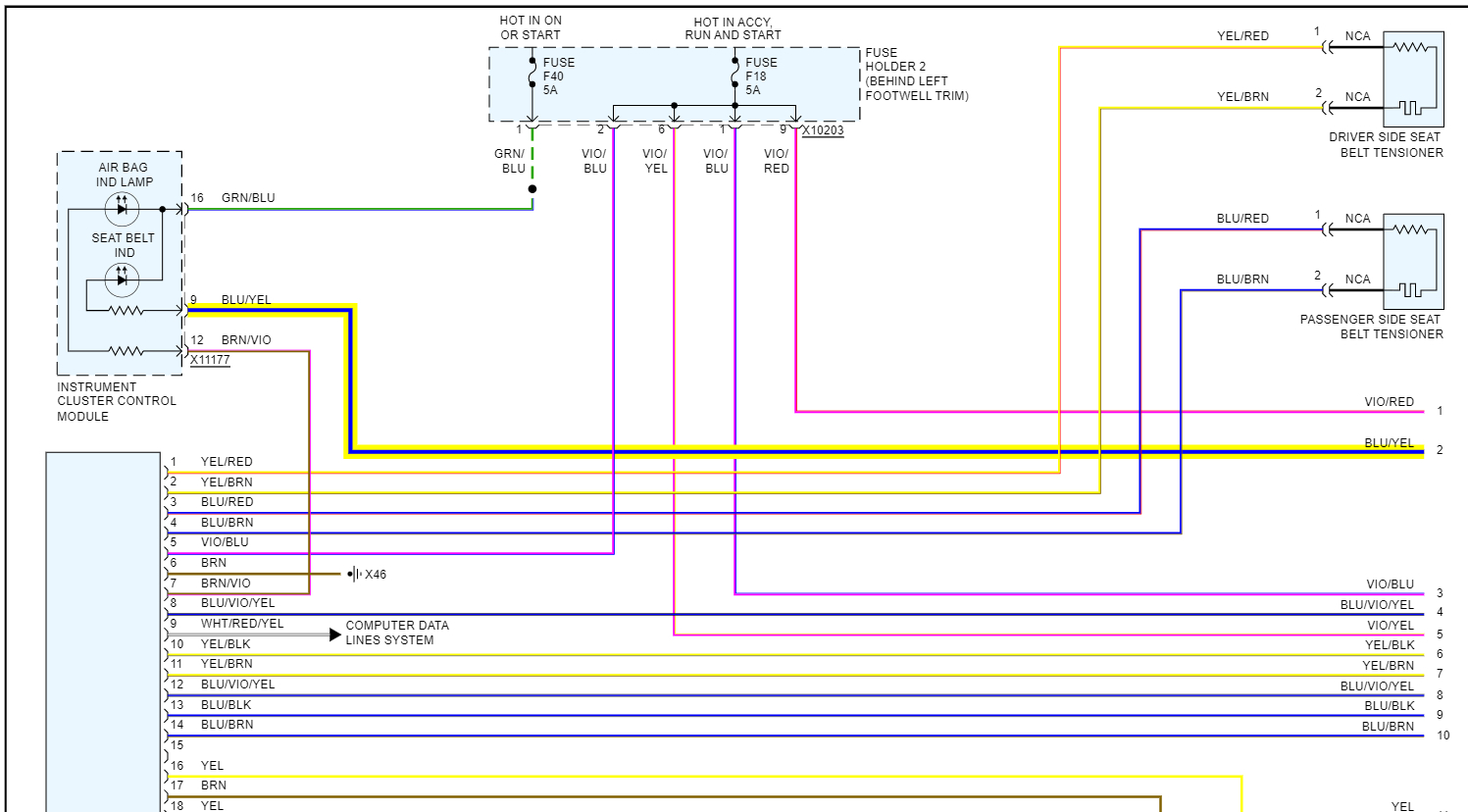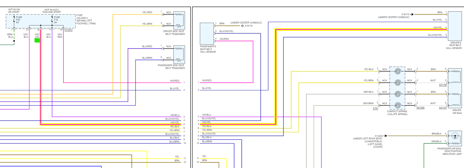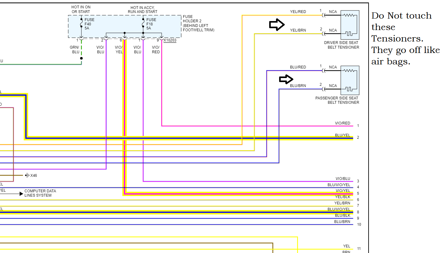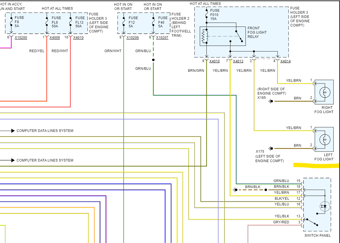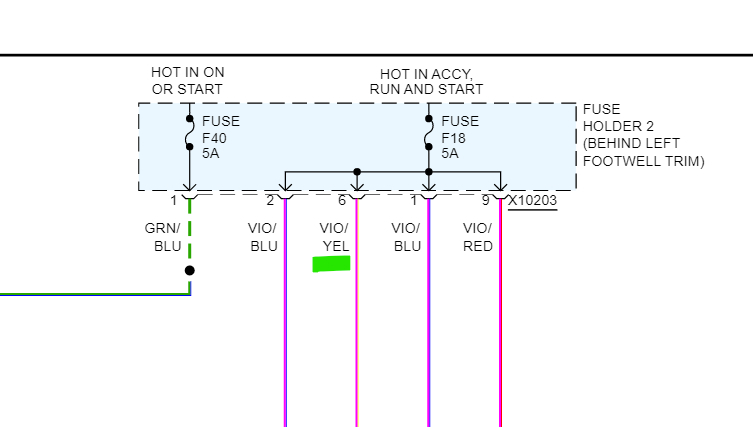 It even shows you the wire color it should be, so black wire with yellow stripe (x10199) and then a Black wire w Violet stripe (x10200). So, you could find those specific wires on those connectors and check them for power. That will tell you if the power is being lost in the Fuse panel (Fuse Holder 2) or if the power is not even getting to the fuse panel.