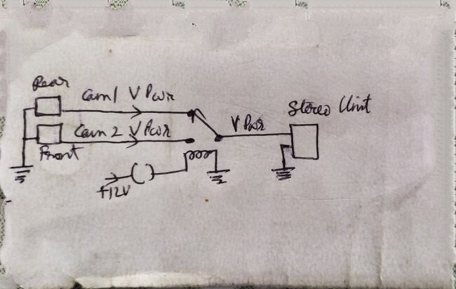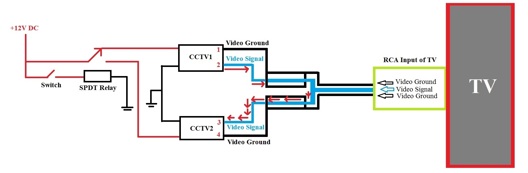 Now, I want to add second video source say CCTV2 to the same input RCA port using 2 input RCA to 1 output RCA splitter cable as shown in attached photos. I add a switch to the power supply side of the second CCTV2 so that I will be able to switch between the 2 CCTVs with only one camera activated at a time. CCTVs has 4 wires - power, ground, video signal and video ground.