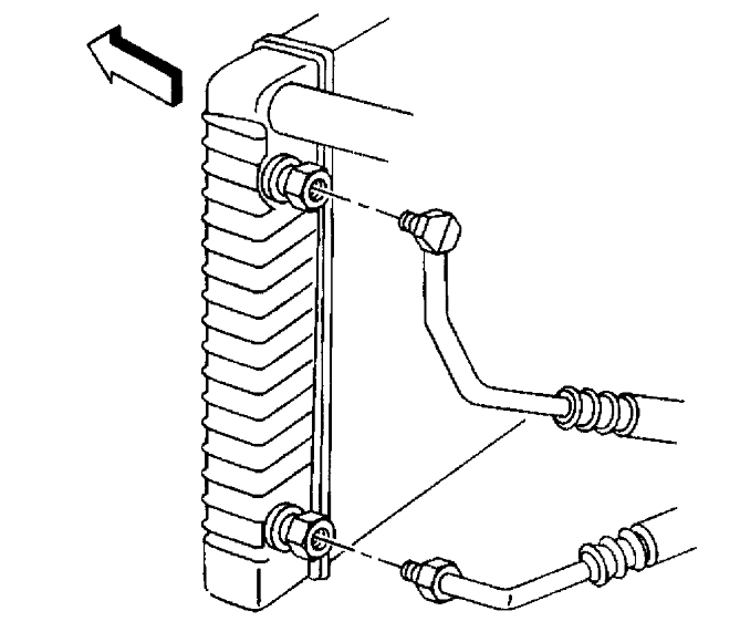 9. Remove the engine oil cooler lines from the quick connectors at the radiator engine oil cooler inlet and outlet.