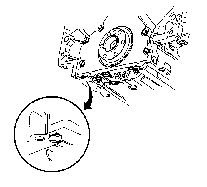 1. Apply a 5 mm (0.20 inch) bead of sealant GM P/N 12378190, or equivalent 20 mm (0.80 inch) long to the engine block. Apply the sealant directly onto the tabs of the front cover gasket that protrudes into the oil pan surface.