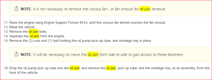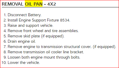 I have attached a few pictures showing the steps how to remove the oil pan. Be sure to remove all the old gasket to help better seal the new one. In the picture it shows the torque sequence when installing the oil pan. The bolts are to be torqued to 130 inch lbs. Hope this helps and feel free to ask any other questions if needed. Thanks for using 2CarPros.
