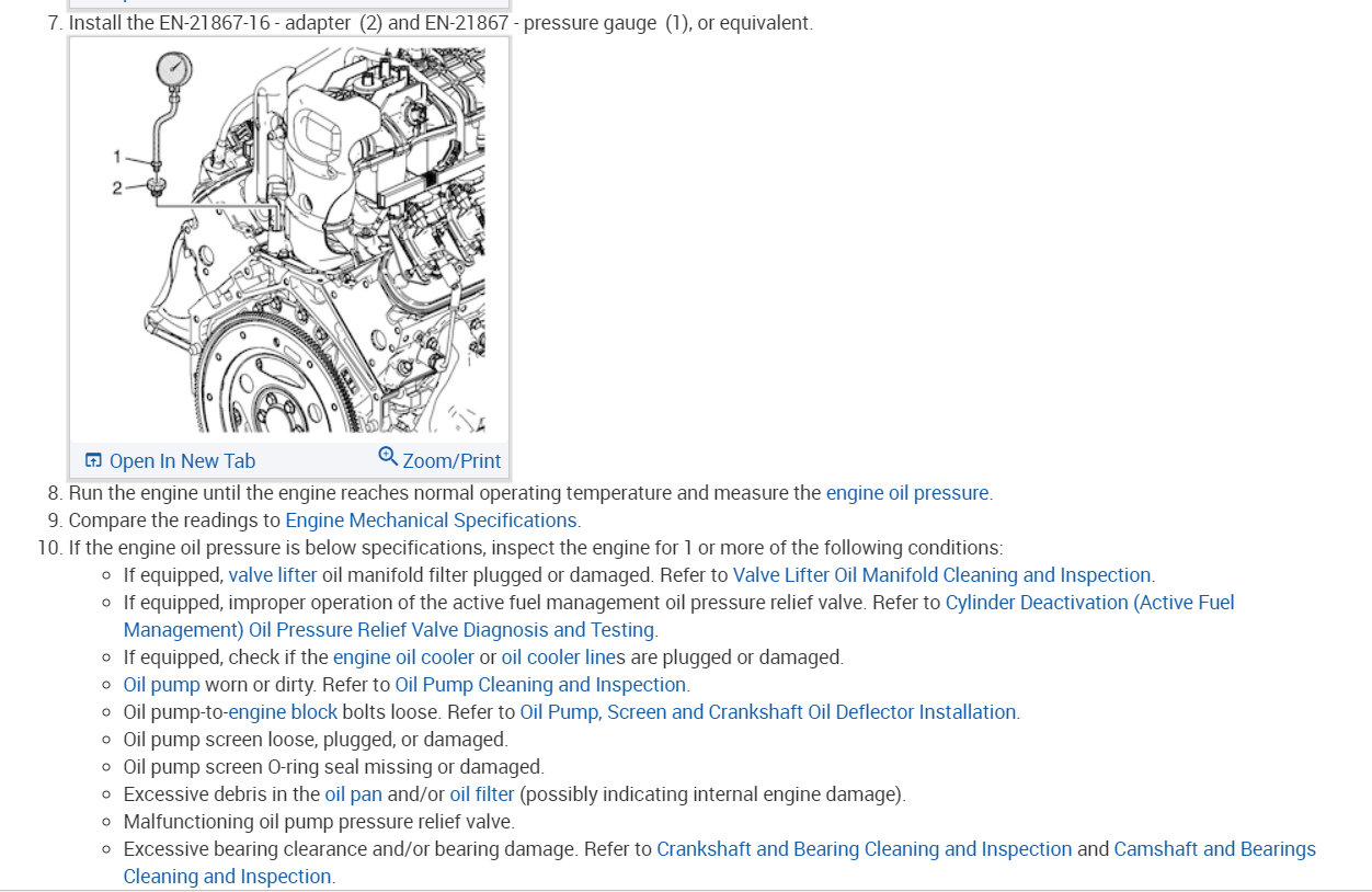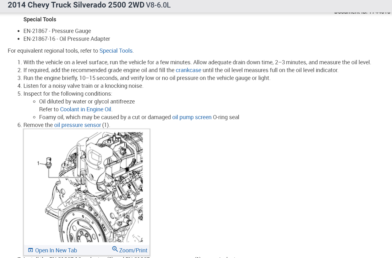 The truck listed above is a 2500HD 4WD, it has a check engine light, accompanied by 0 OP on the panel gage. The dipstick shows the crankcase is serviced up to full. From what I can discover it looks as if the xmitter is at the rear of the engine, behind the throttle body - a real delight to access. Is there somewhere I can plumb in a direct reading gage to see if there actually is or is not oil pressure, so I can narrow it down to the sensor or pump? I'm assuming it's the transmitter because after a few minutes running there is no lifter noise which I figured would indicate actual absence of hydraulic oil pressure?