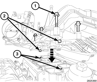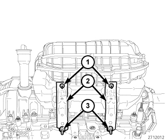 Remove two nuts (1), loosen two studbolts (3) and reposition the two upper intake manifold support brackets (2).