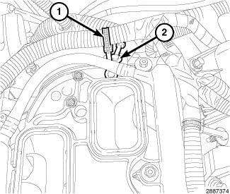Disengage the main wire harness retainer (2) from the rear of the lower intake manifold.