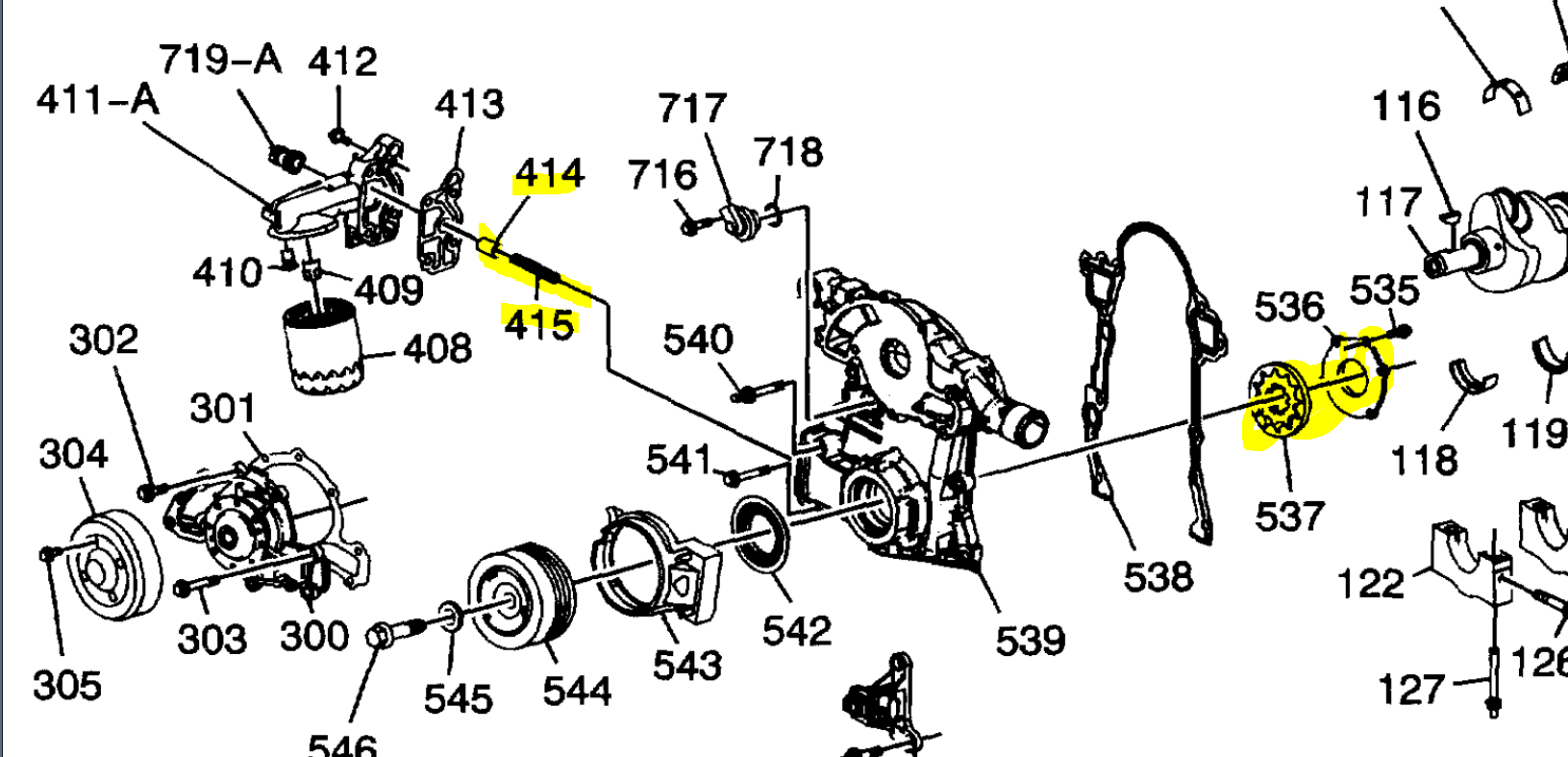 Rotate the pump driveshaft as necessary to engage the with the oil pump. Make sure it turns smoothly. Some technicians will fill the oil pump through the opening next to the driveshaft to shorten the time it take the engine to buildup oil pressure on initial startup after an oil pump replacement. Turning the driveshaft as oil is being added fills the pump cavity.