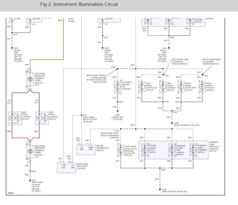 My wife was driving home one night in the dark, half way home, all of a sudden all the "white" dash lights went out. There are still a few colored lights on but all the back light went out on the instrument panel, radio, and climate control. Everything works fine, you just can't see how fast you are going, what preset button on the radio you are hitting, or if you're turning on the heater or defroster. I checked the obvious things, headlight switch and instrument panel switch don't change anything (Headlights work and I can still turn on the interior lights with the dimmer switch). I then checked the fuses and didn't find any blown, the only one that made sense for the instrument panel also included the radio and that works, so I just pull them out one by one checking them, including the fuse box under the hood.