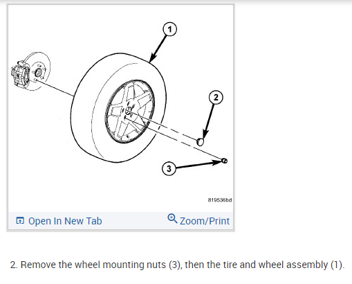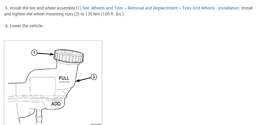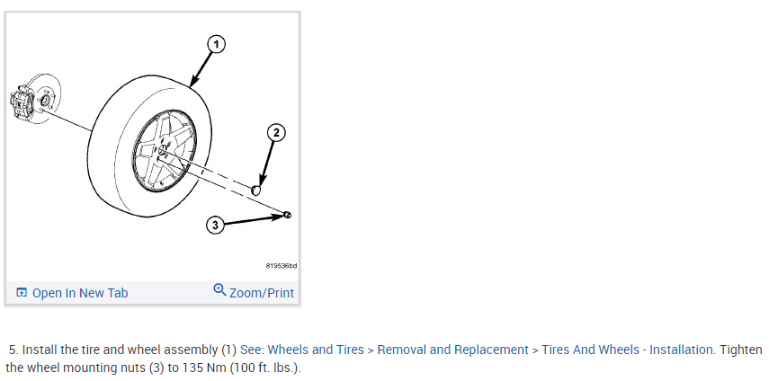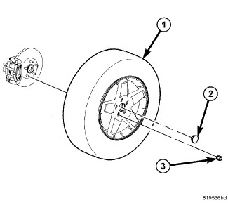 5. Install the tire and wheel assembly (1) See: Wheels and Tires > Removal and Replacement > Tires And Wheels - Installation. Install and tighten the wheel mounting nuts (3) to 135 Nm (100 ft. lbs.).