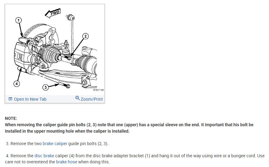 When installing the caliper guide pin bolts (2, 3) make sure that the one that has a special sleeve on the end is installed in the upper mounting hole.