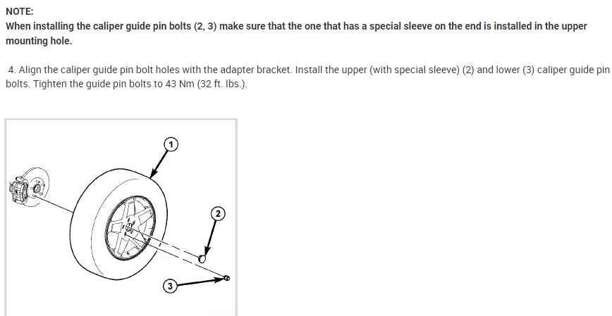 4. Align the caliper guide pin bolt holes with the adapter bracket. Install the upper (with special sleeve) (2) and lower (3) caliper guide pin bolts. Tighten the guide pin bolts to 43 Nm (32 ft. lbs.).
