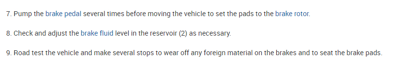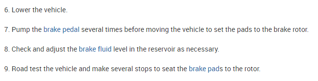 7. Pump the brake pedal several times before moving the vehicle to set the pads to the brake rotor.
