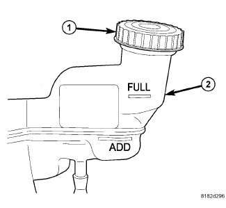 8. Check and adjust the brake fluid level in the reservoir (2) as necessary.