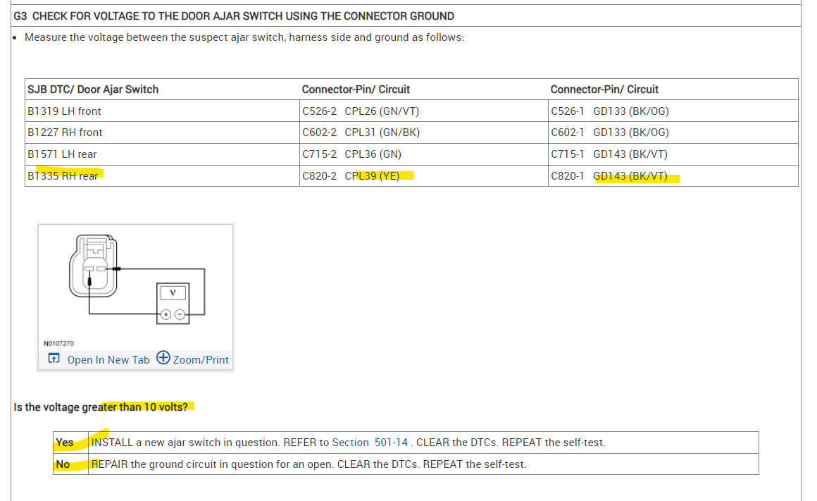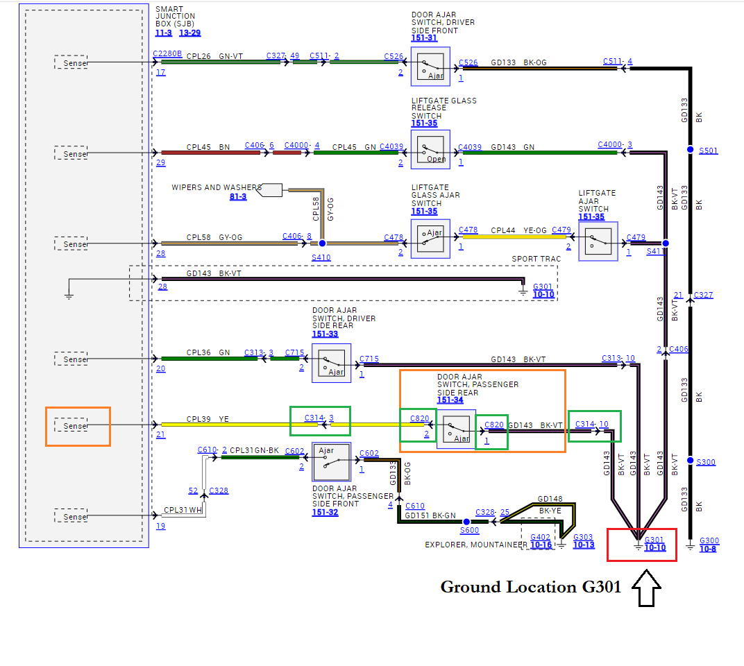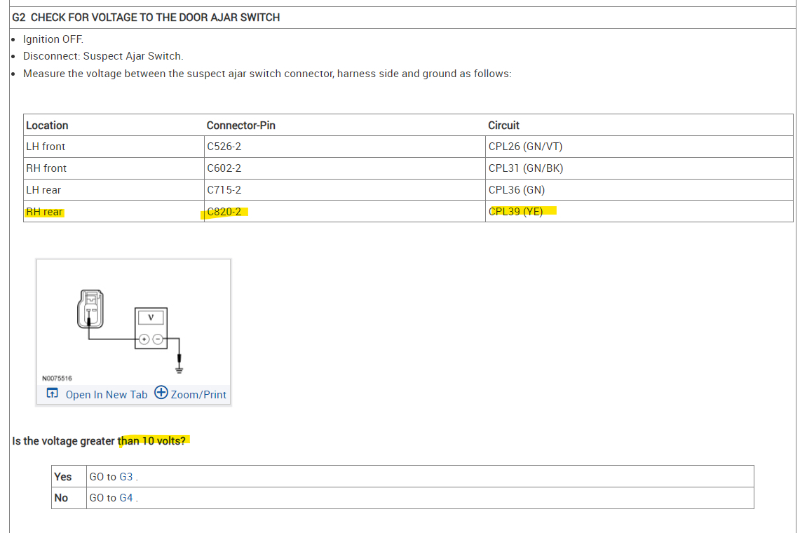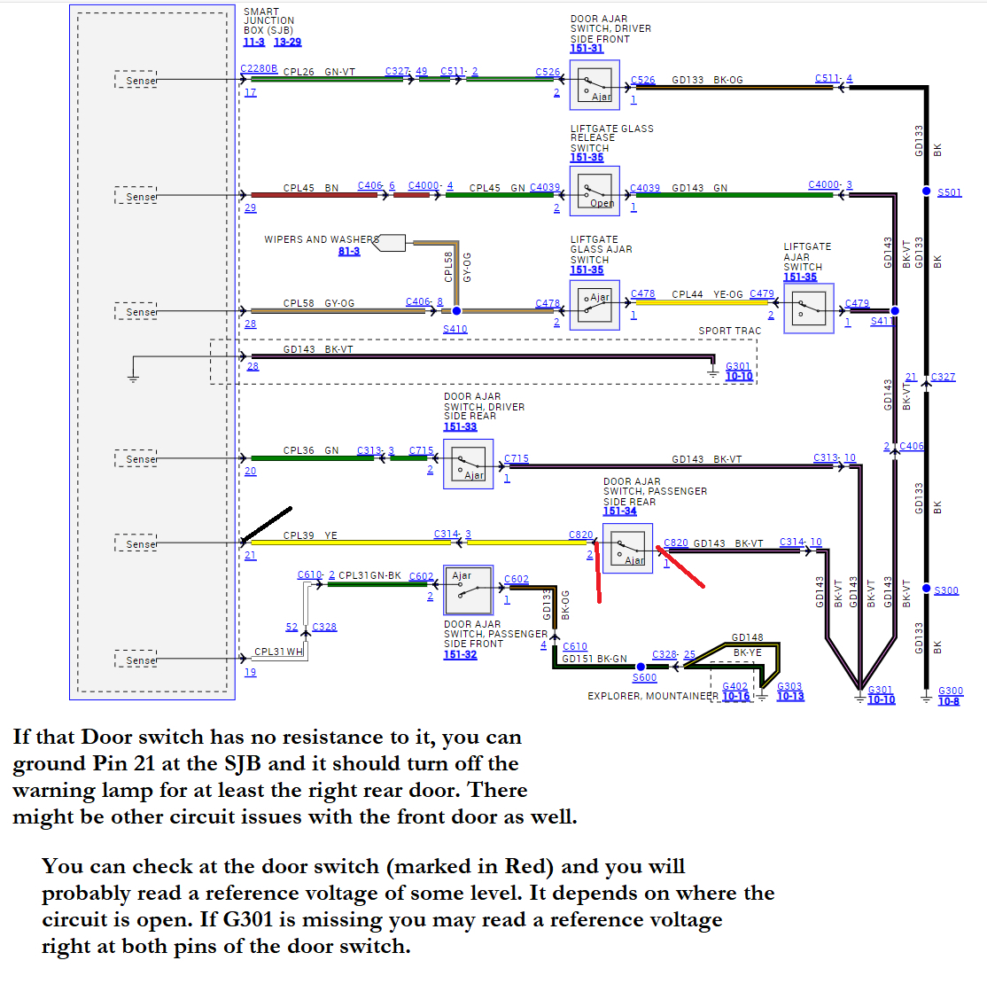 Diagram 1 is the Door AJAR switches, which the Passenger side rear switch has a normally closed position, so that's with the door closed, the switch goes open when the door is opened. Now the Front Door AJAR switches do the opposite, when the door is closed the switch is open, and then when the door is opened the switch goes closed. So, you'll have to note that. If you look really close you can see the AJAR position of the pass side rear door is the switches 2nd position. These switches are pulled to Ground when operated, and most likely do not have any resistance to them, but you could check if needed. If they show no resistance, (so it's just an open/closed type switch), you could ground the black/violet wire which goes to Ground location G301.