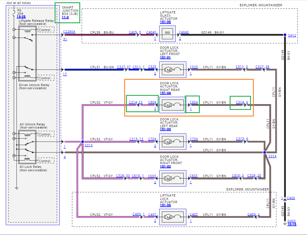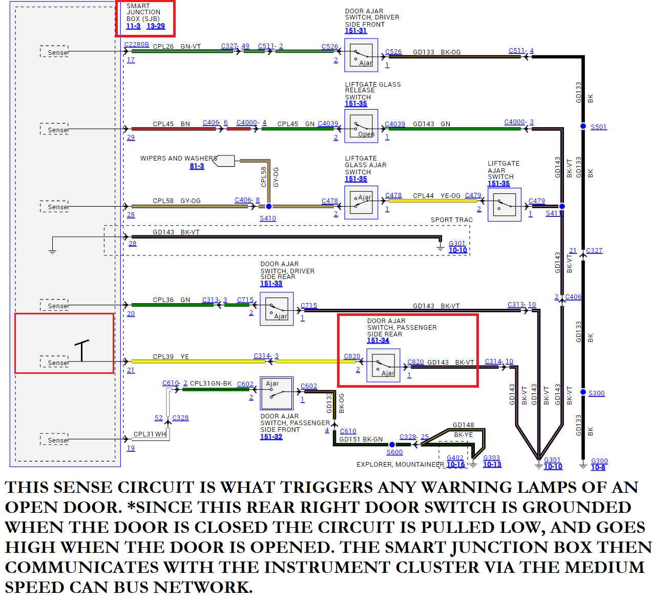 But also note how many connectors there are in that one circuit for the rear passenger door switch. Any one of those could have been damaged in the crash, we should be able to look up their locations if needed.
