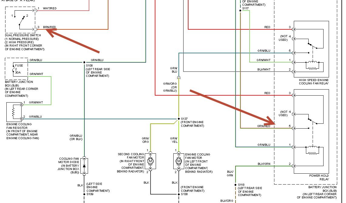 Over heating a/c fans work not the cooling fan replaced both relay 50&30 fuses & a 2 amp fuse also CHT sending unit fan resistor & new pig tail checked both relays jump term 3 to5 both fans came on r15, R16 3 to5 one fan came on new rad cap STILL over heating NO fan