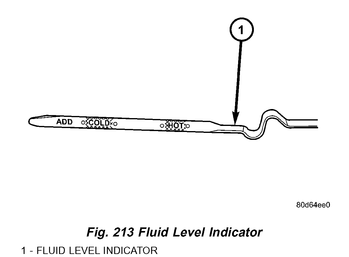 7. Check the transaxle fluid level and add an appropriate amount to bring the transaxle fluid level to 3mm (1/8 inch) below the lowest mark on the dipstick (Fig. 213).