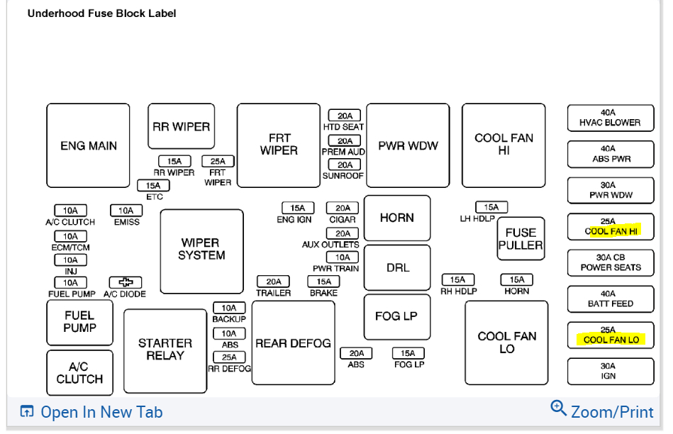 If the fans do not turn on, turn the engine off, open the hood, and locate two fuses for me, cooling fan low and cooling fan high fuses. See pics 1 and 2 below. Check both fuses. Additionally, check to see if there is power to and from them. They should have power at all times.