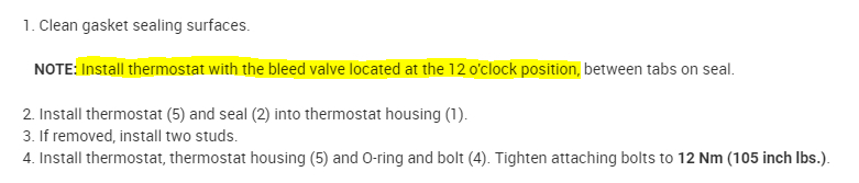 Also, two things to remember. There is a bleeder valve on the thermostat (some refer to it as a jiggle valve). Make sure that it is in the 12 o'clock position when you install it. If it isn't in that position, bleeding air from the system is more difficult. Additionally, make sure to lubricate the new o-rings with coolant before installing.